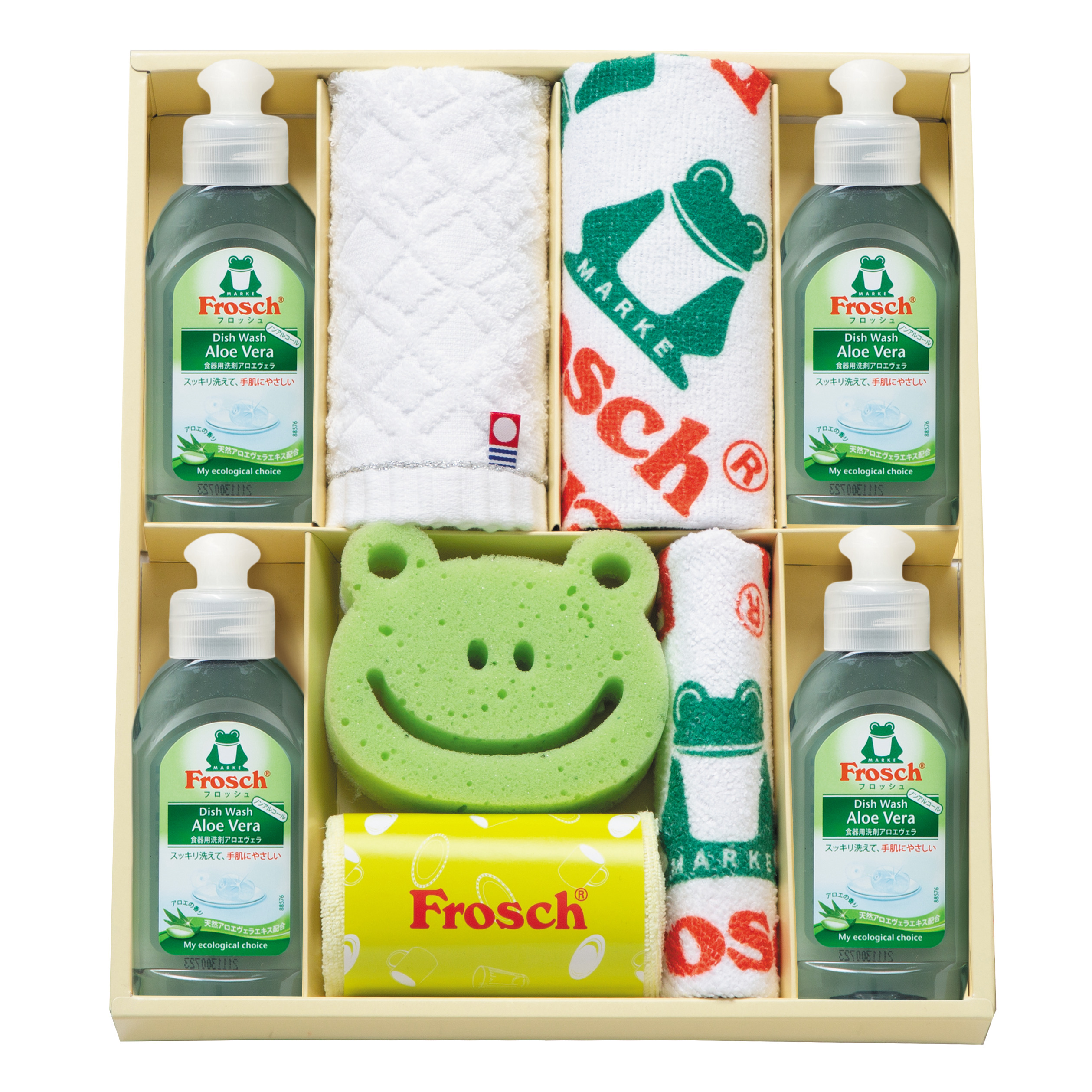 フロッシュミニ(アロエヴェラ)(100ml)×4 マイクロファイバークロス(25×25cm)×3 スポンジ×1 今治ウォッシュタオル(28×30cm)×1