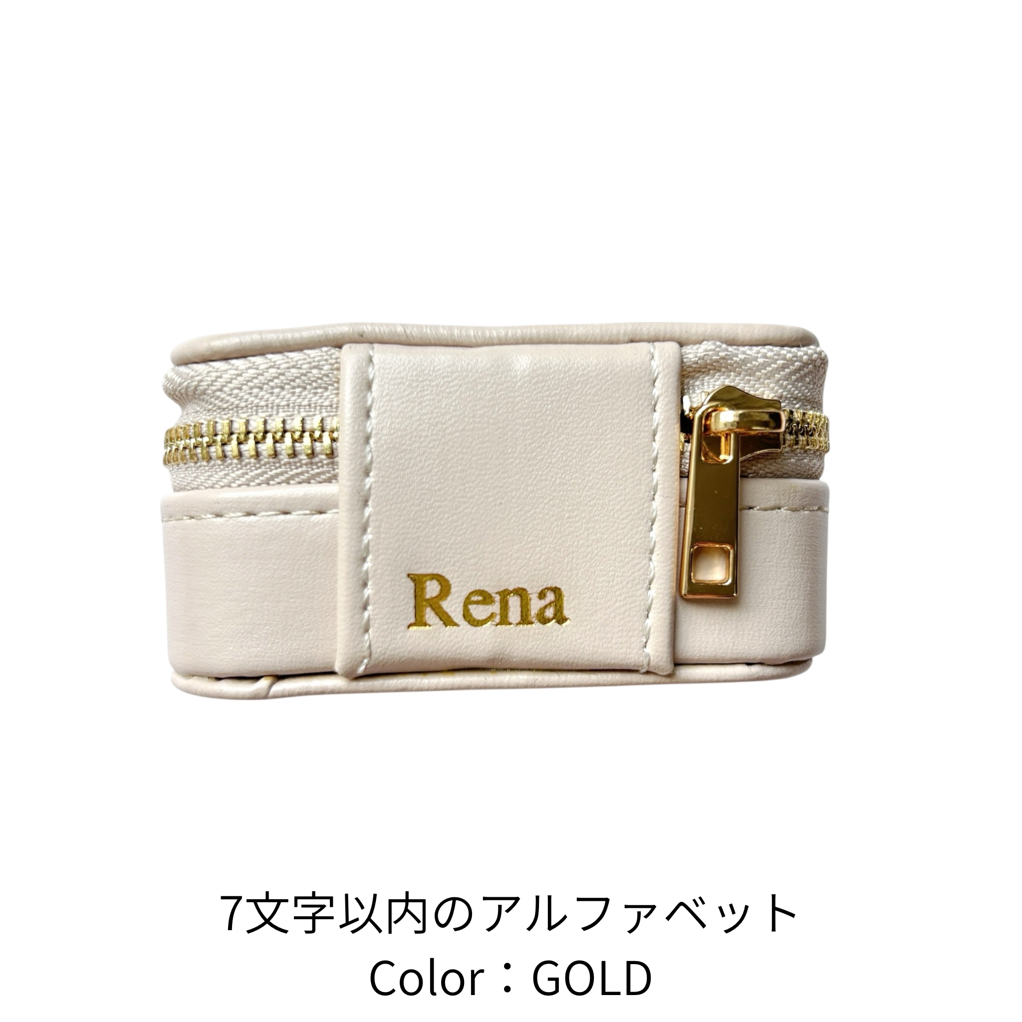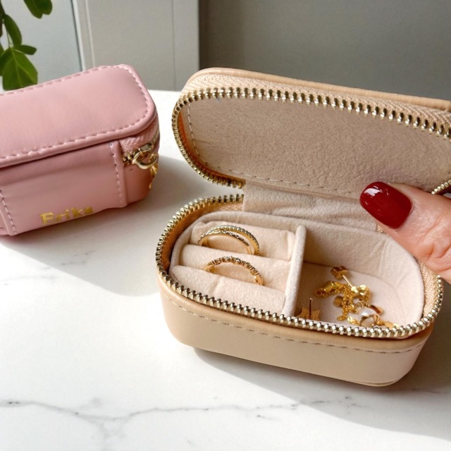 世界に一つのオーダーメイドの手のひらサイズのジュエリーBOX。お好きなお名前をゴールドの刻印でお入れできます。選べるラッキーチャーム付き。旅行やお出かけにも持ち運びしやすく、大切なアクセサリーを美しく収納できます。