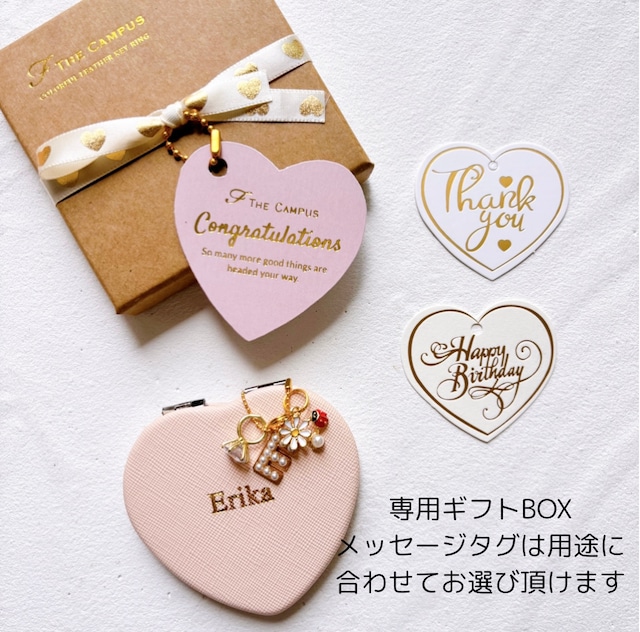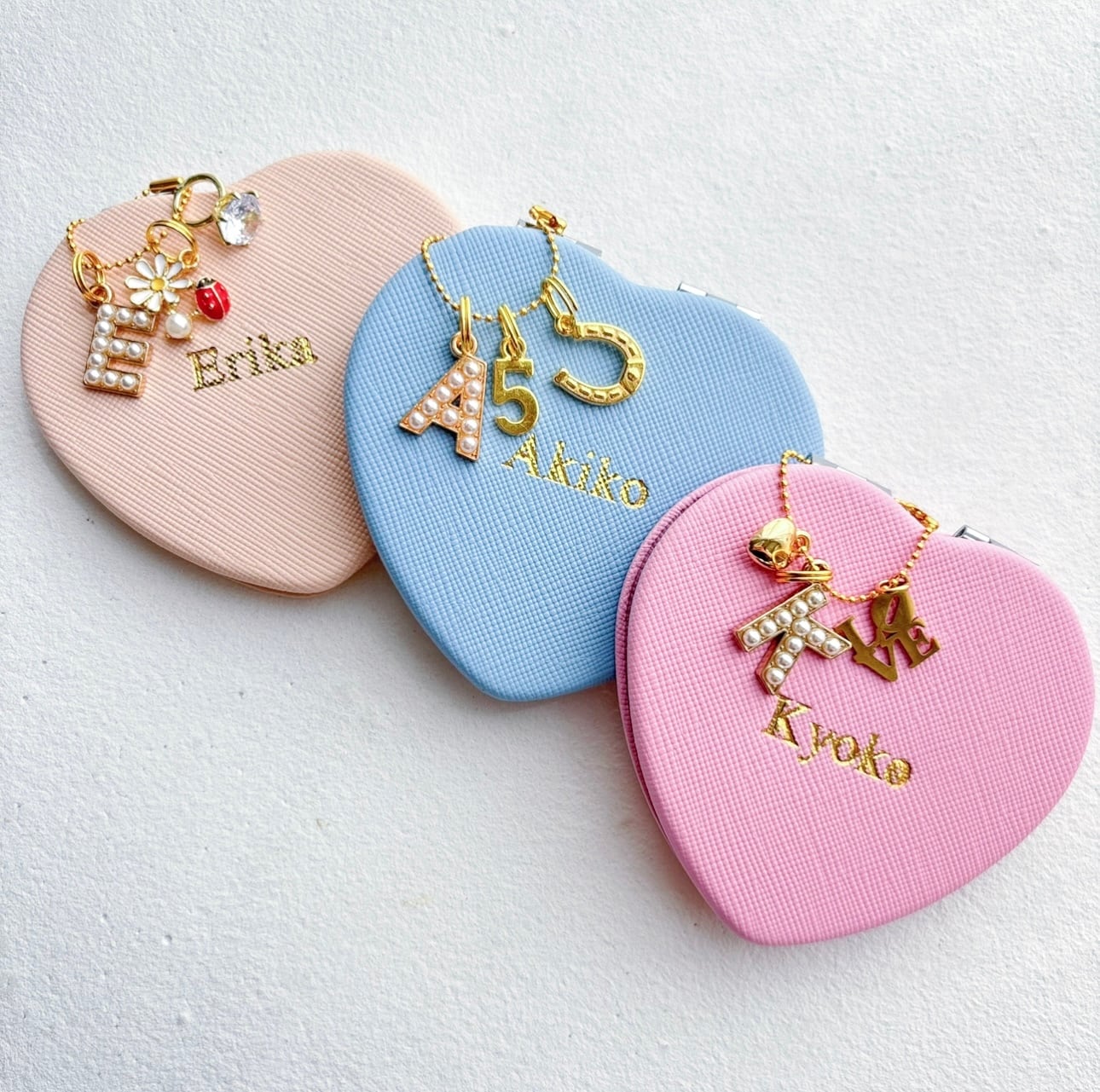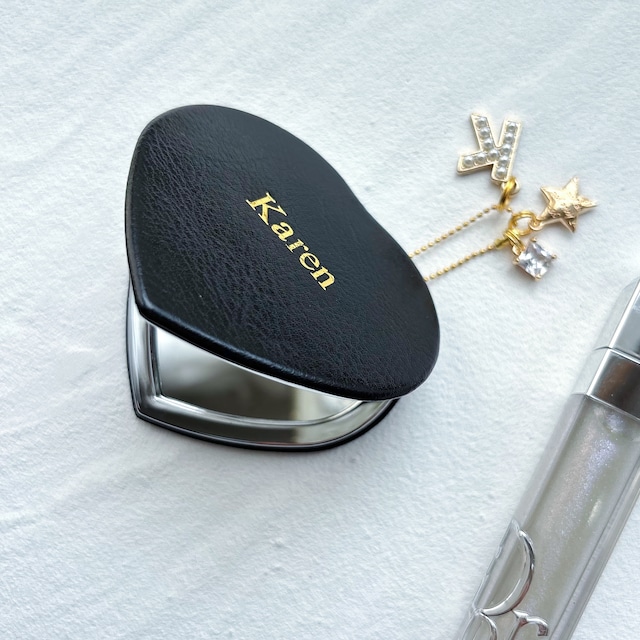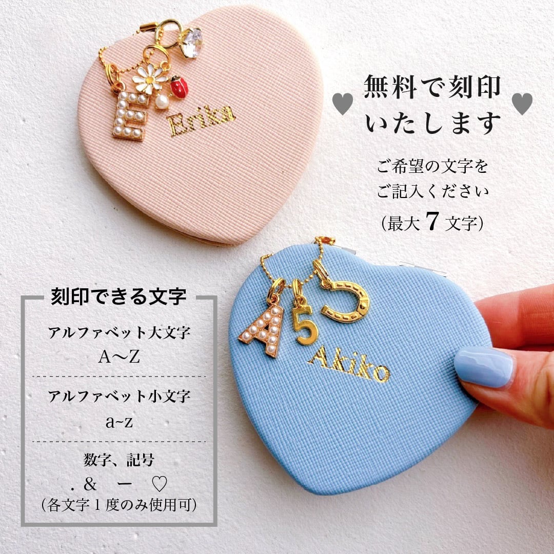 世界に一つのオーダーメイドハンドミラー。上品なレザー調素材にゴールドの刻印が映えるおしゃれなデザイン。パールのイニシャルと選べるラッキーチャーム付き。メイク直しの時間が特別に感じられるアイテムです。