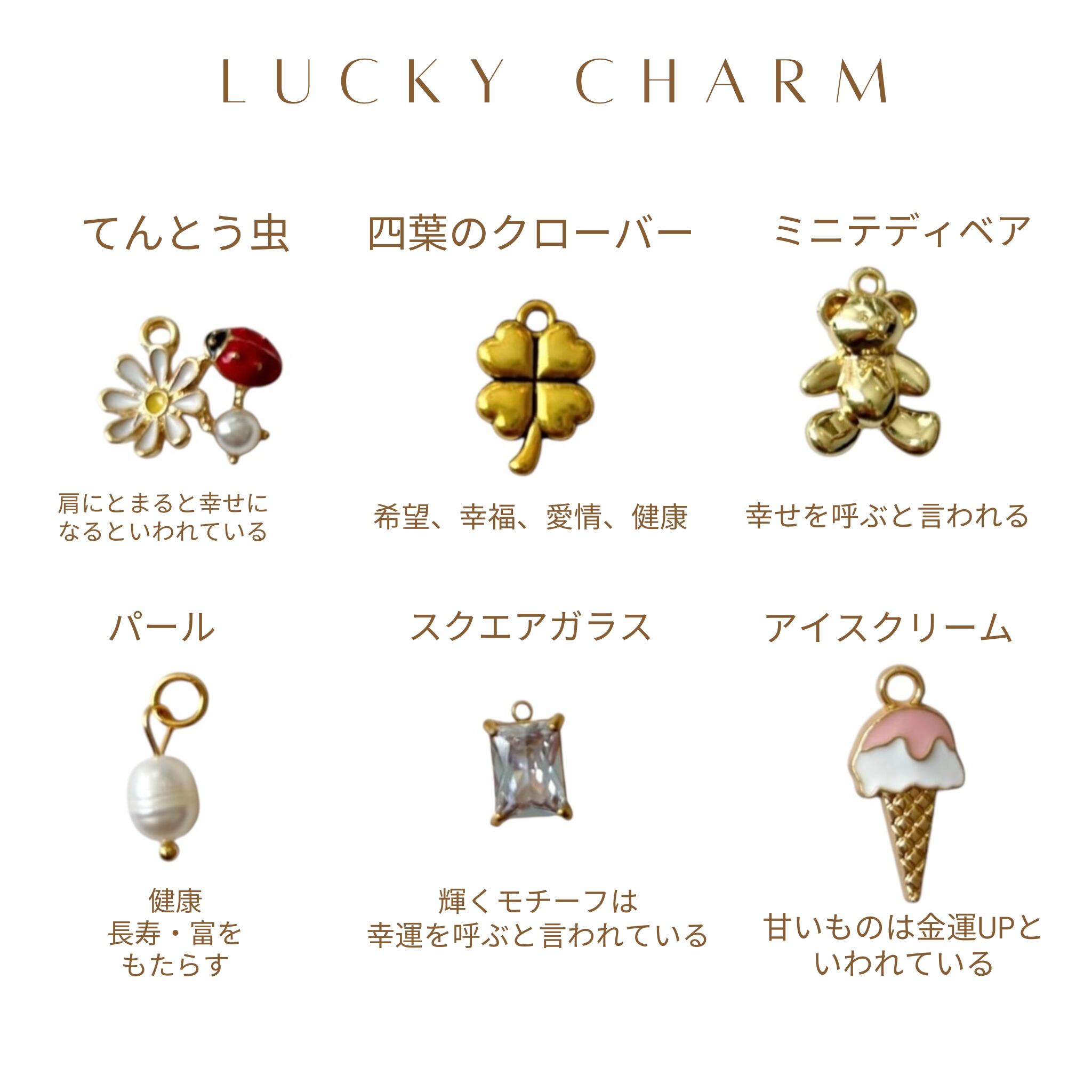 ラッキーチャームとは昔から世界中で愛されている幸運のお守りのことで、様々な意味があると言われています。 1つ目にイニシャルをお選び頂き、その他からお好きなものをお選びください。 ※2~3つ目のラッキーチャームはオプションよりお選びいただけます。 ※3つ目は有料となります。