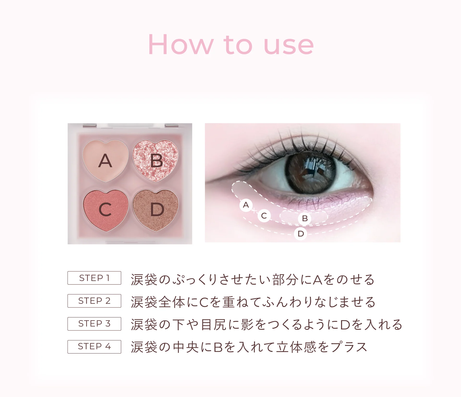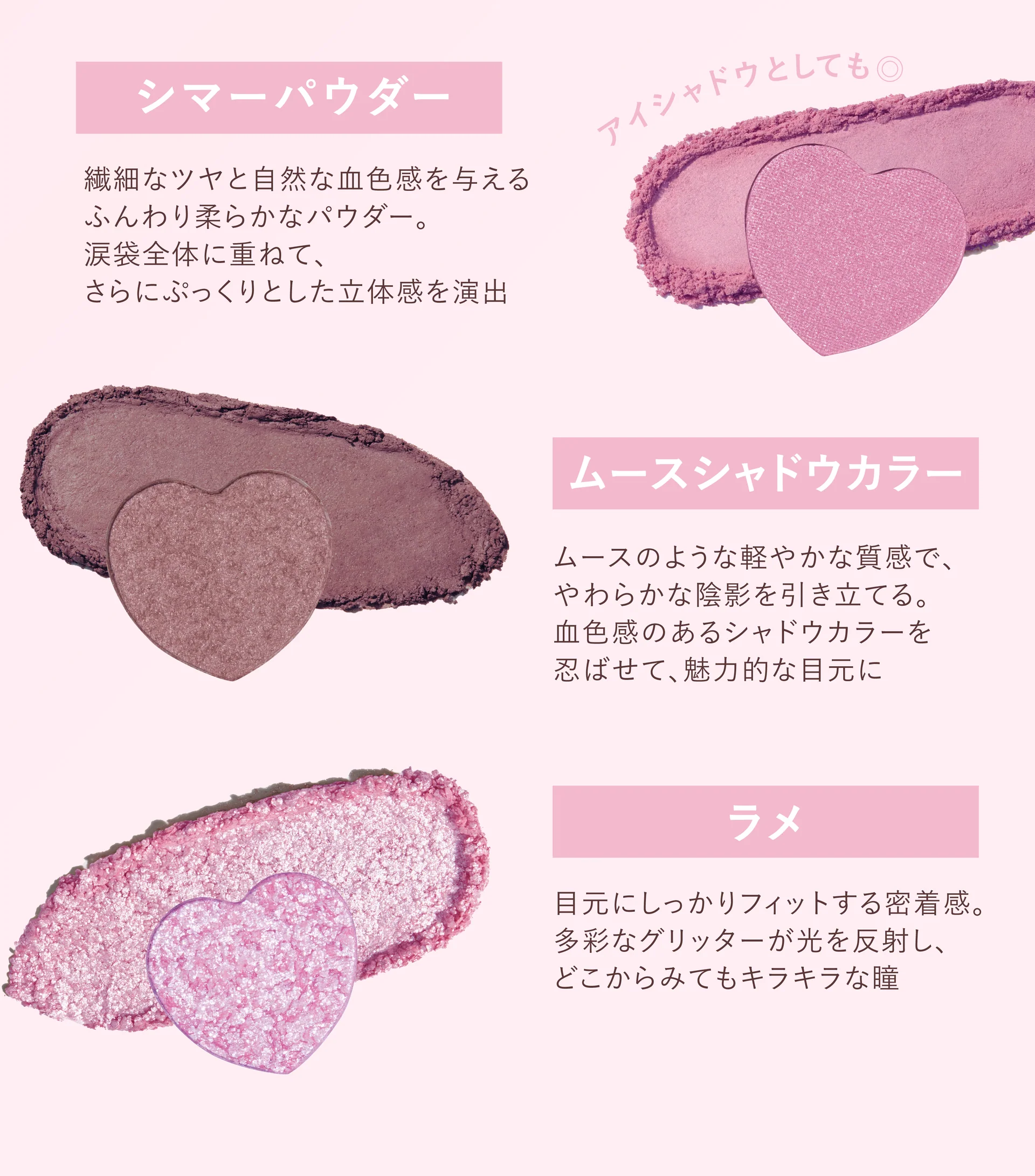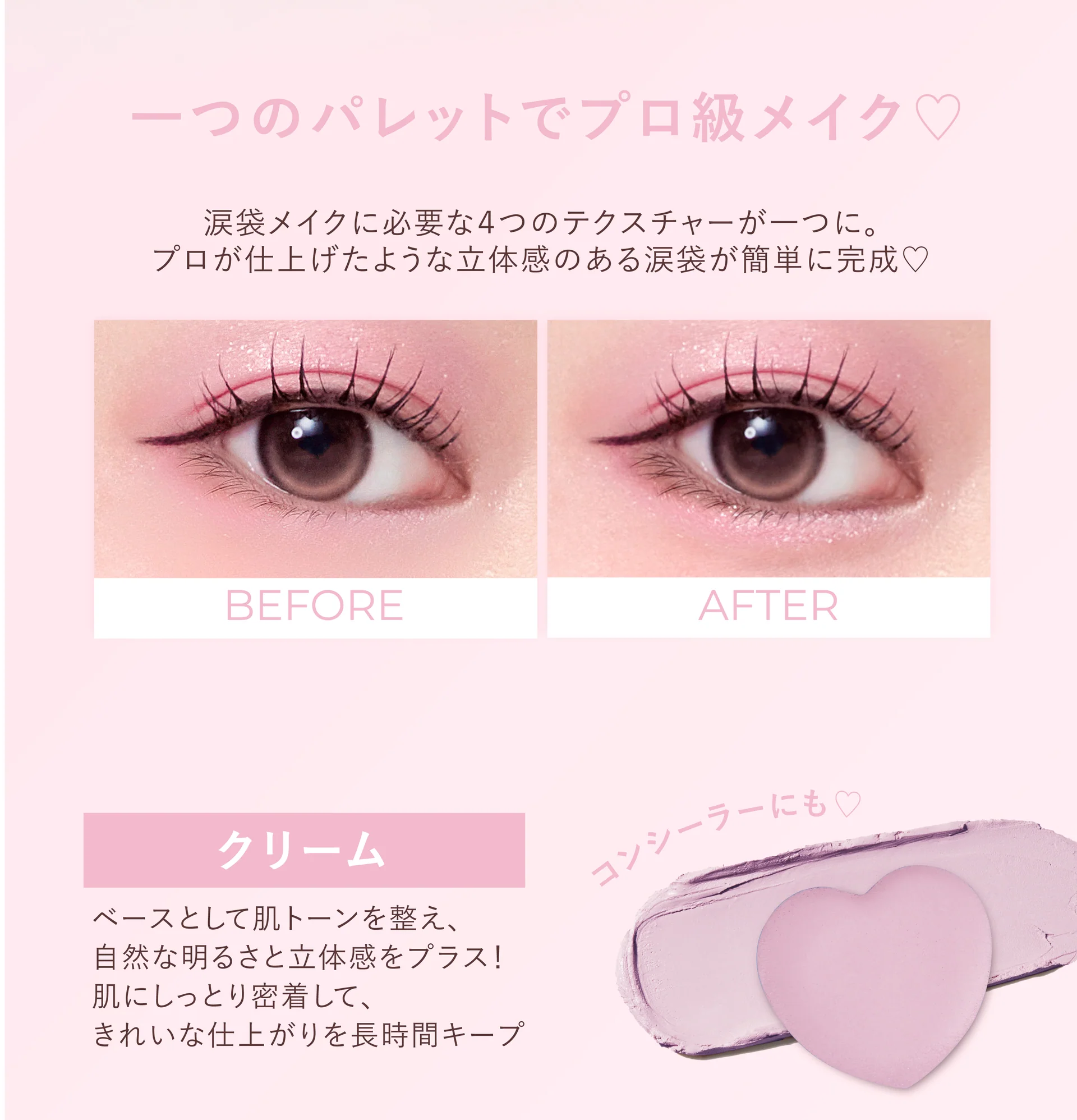 かわいいチャームつきの涙袋用アイシャドウパレット。涙袋用3色、涙袋の影用1色の4色入りパレットで、自然な涙袋をつくります。一つのパレットでプロが仕上げたような立体感のある涙袋が完成します。