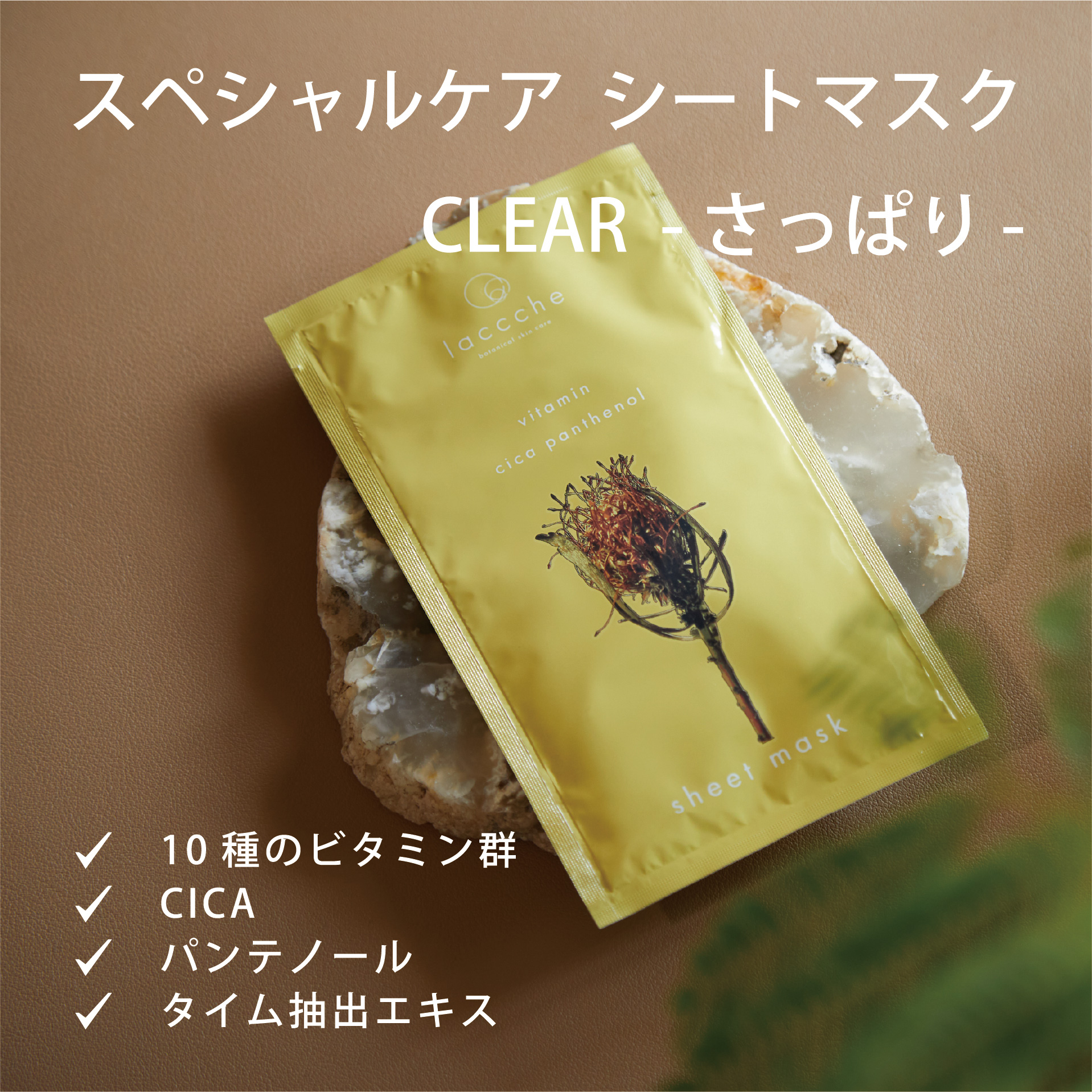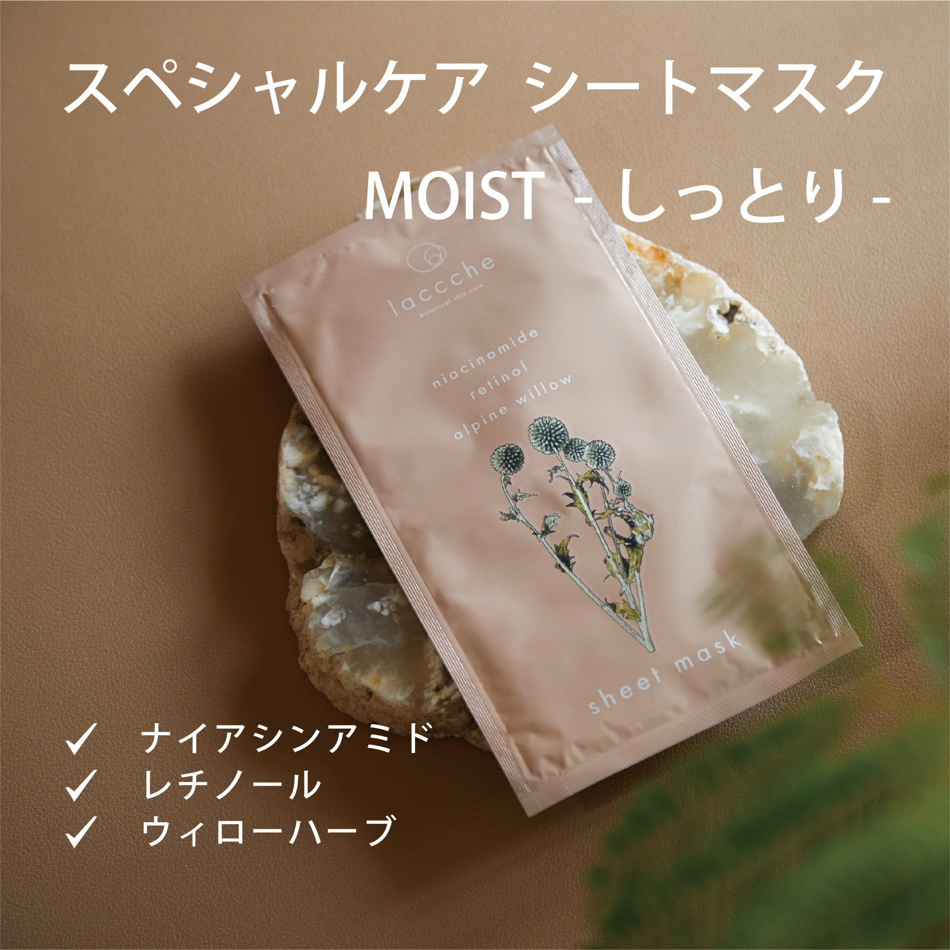 2025年春に誕生したボタニカルスキンケアのブランド「laccche(ラッシェ)」の植物由来のボタニカル成分で構成された肌にやさしいシートマスク。ビタミン、レチノール、ヒアルロン酸などの人気のある成分に、「タイムエキス」「ウィローハーブ」「ネムリペア」といった睡眠時に働きかける成分を中心とする次世代成分を配合しています。