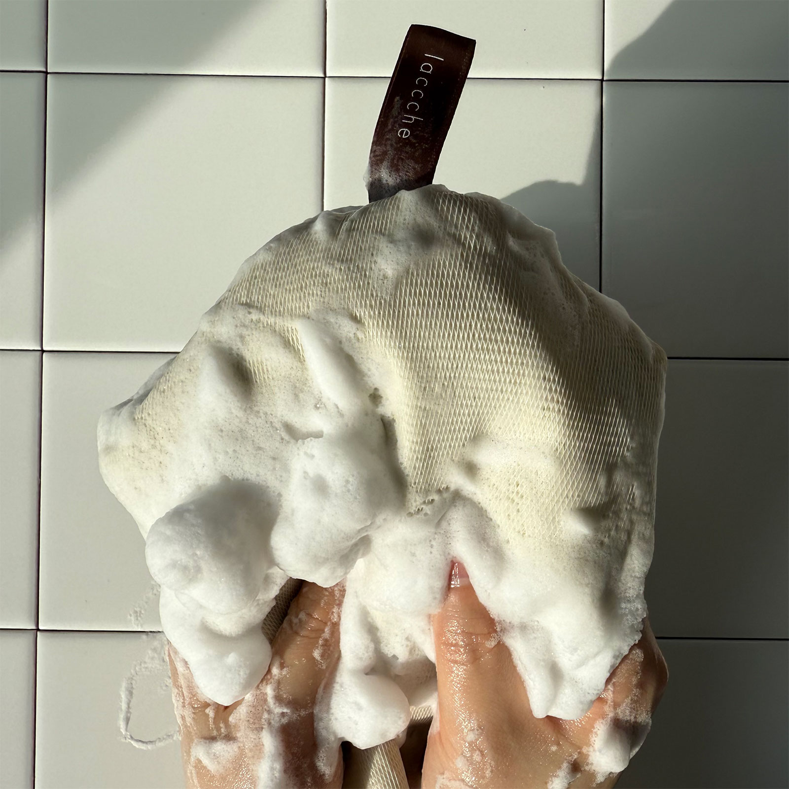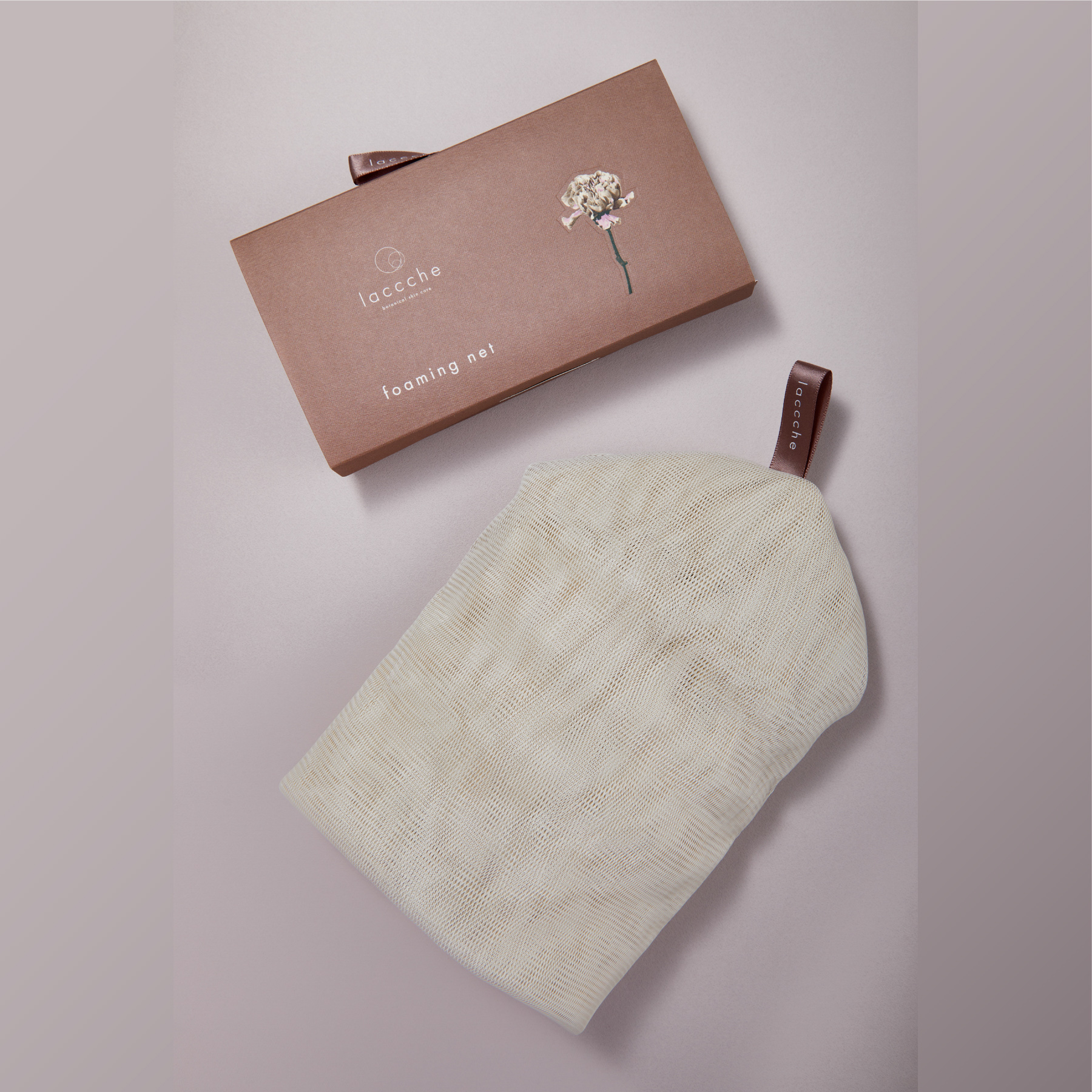 2025年春に誕生したボタニカルスキンケアのブランド「laccche(ラッシェ)」の6層ネット+ 2層石けんポケットの8層泡立てネット。大きめサイズでキメの細かいやさしい泡がすばやく作れます。