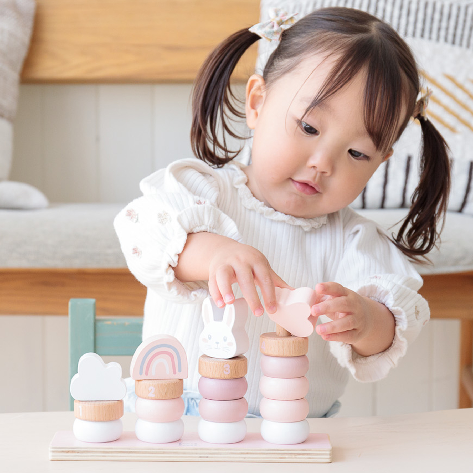 リングを1つずつ棒に通していき、数の感覚を手で感じて学べるおもちゃ。色や形の違いを見分ける力も養えます。遊びながら「考える」「試す」「できた!」という達成感を育むことができ、お子さまの成長をサポートし遊びの楽しさを広げるでしょう。