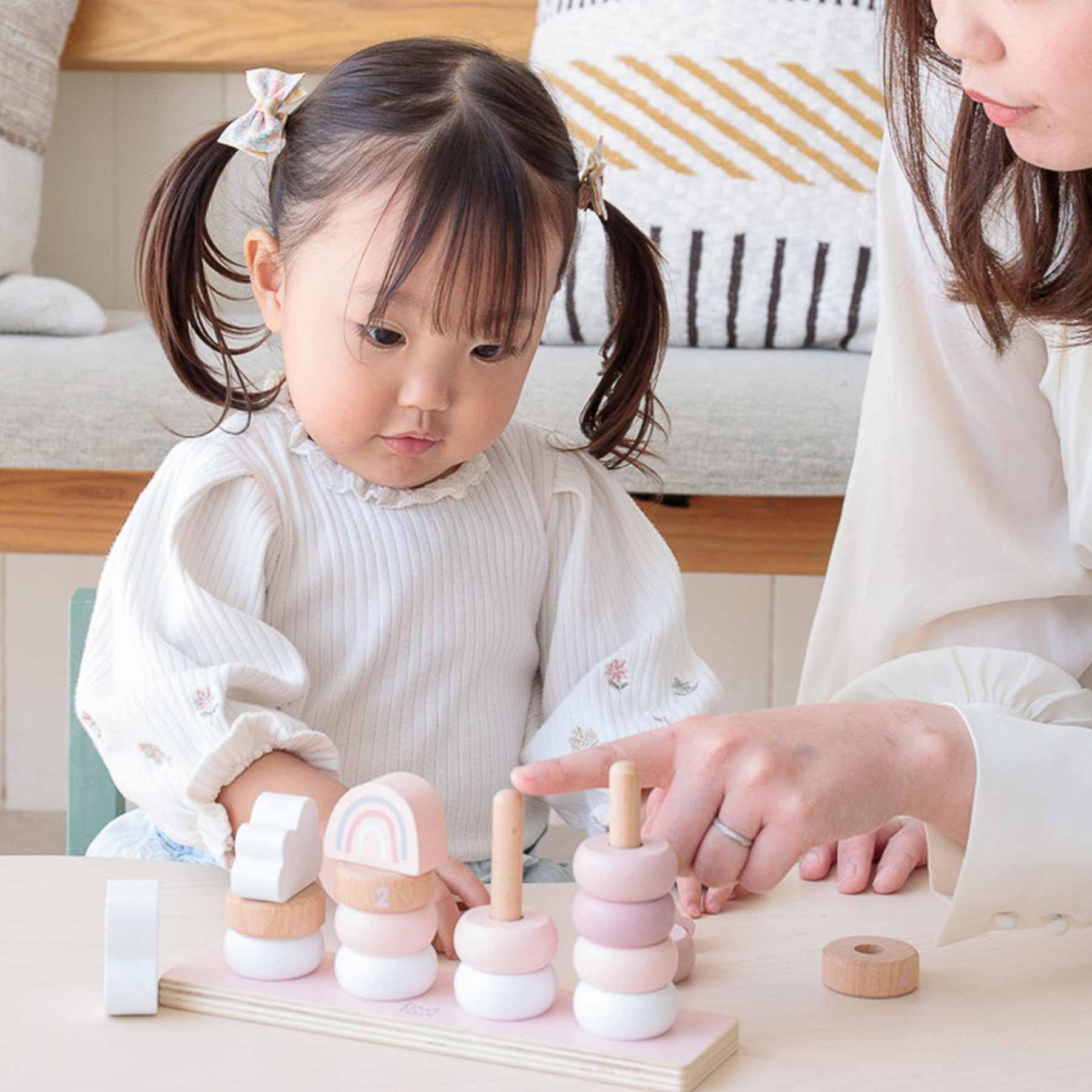 リングを1つづつ重ねていく動作は「いくつある?」「あと何個?」といった数への興味につながります。 数への興味は、将来算数への抵抗感を減少し苦手意識を持ちにくくしてくれます。