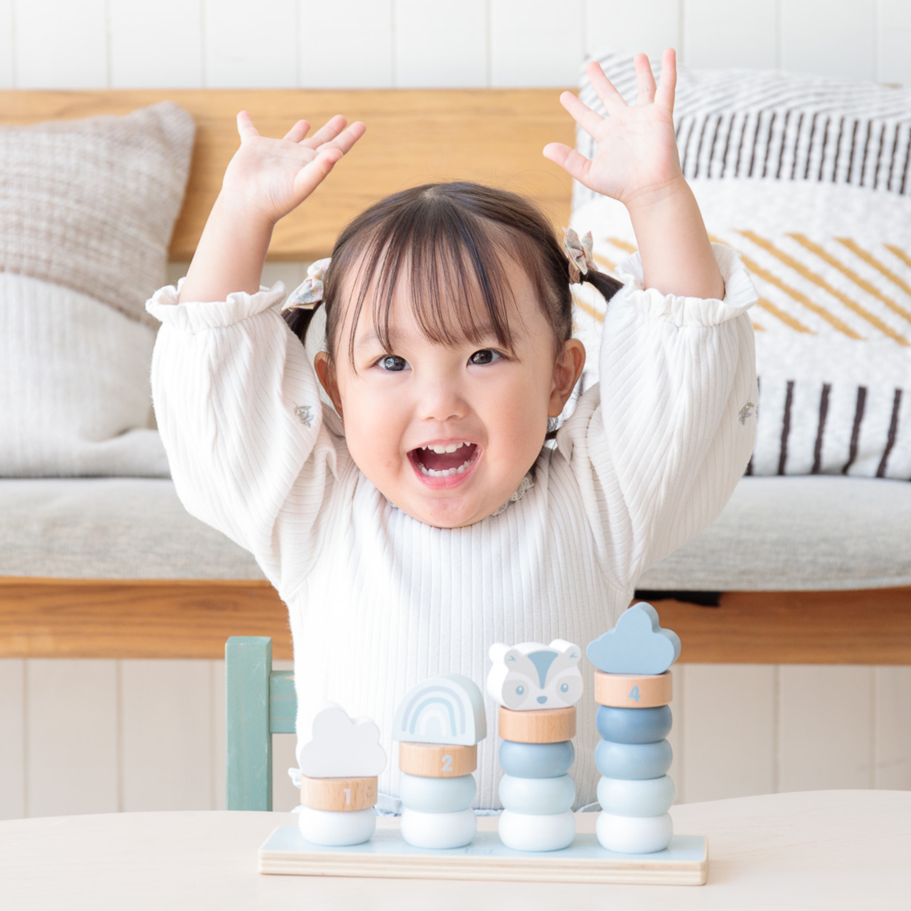 大口注文・法人のお問い合わせはこちら遊びの中にある大切な ”まなび” 。 「考える」「試す」「できた」を繰り返しながら自信と自立心を育む大切なステージに、シンプルながらも知育を意識した木製おもちゃです。