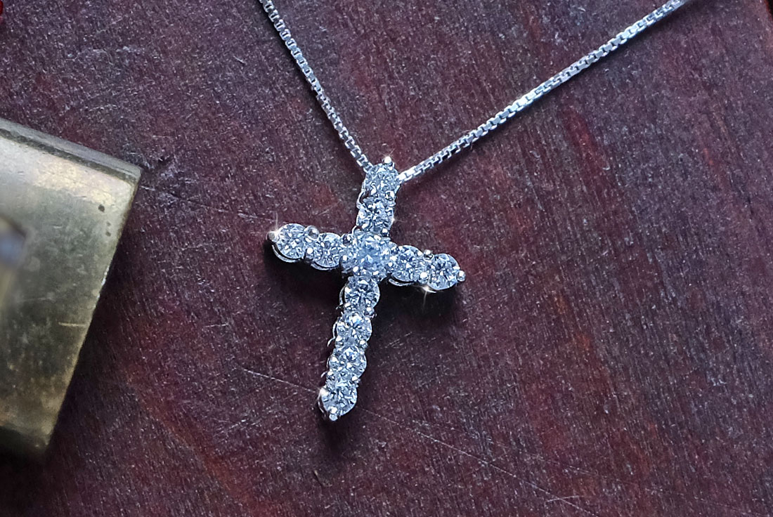 シャープなフォルムに女性らしい輝きを添えた、シンプルなクロスモチーフのネックレスです。大切な日の贈り物としておすすめです。