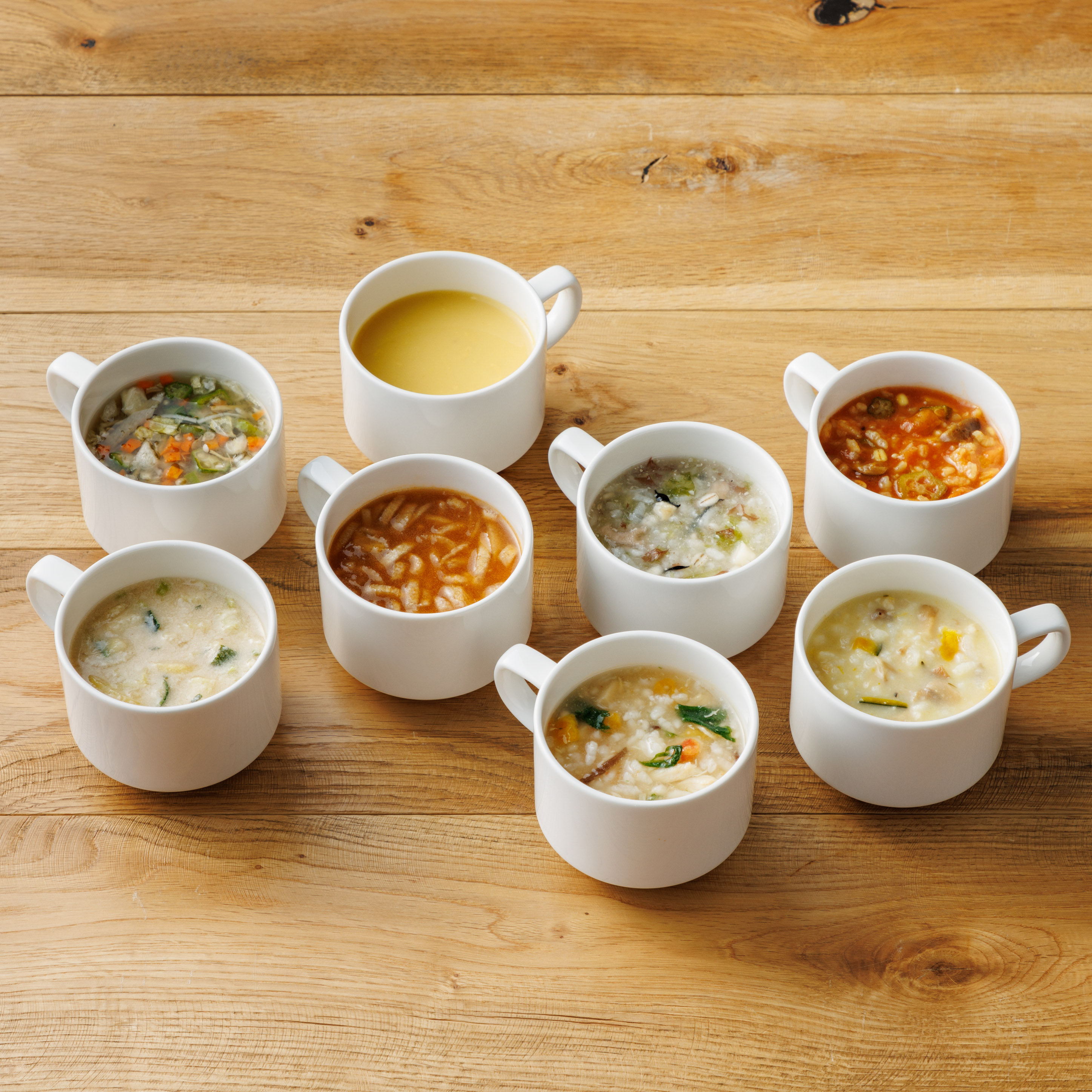 【Soup】 ・ オニオンスープ ×1 ・とうもろこしとさつま芋のポタージュ ×1 ・5種の野菜のミネストローネ ×1 ・魚介のチャウダー ×1 【Okayu】 ・2種のきのことチーズ ×1 ・鶏肉とセミドライトマト ×1 ・鯛と3種の海藻 ×1 ・梅とトマト ×1