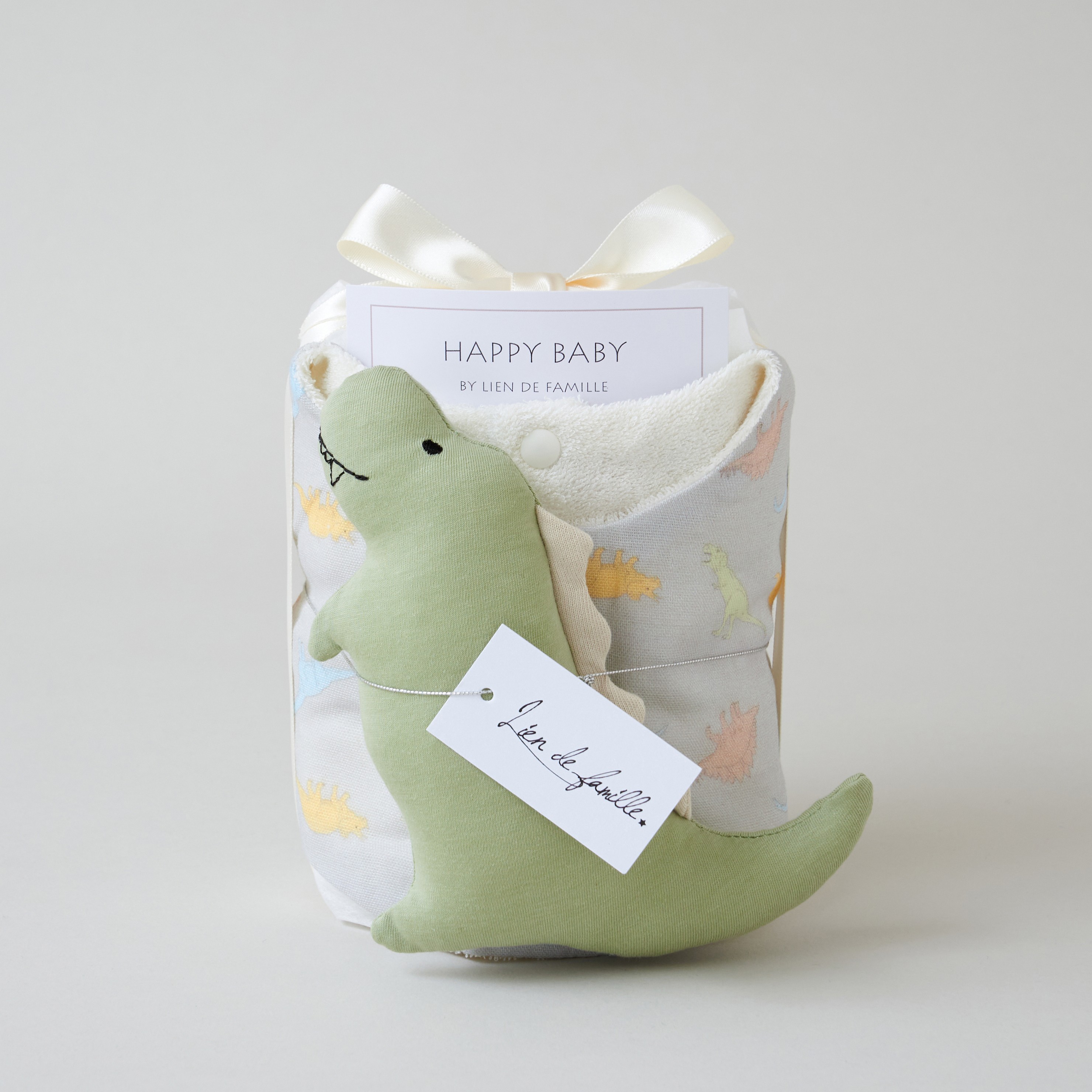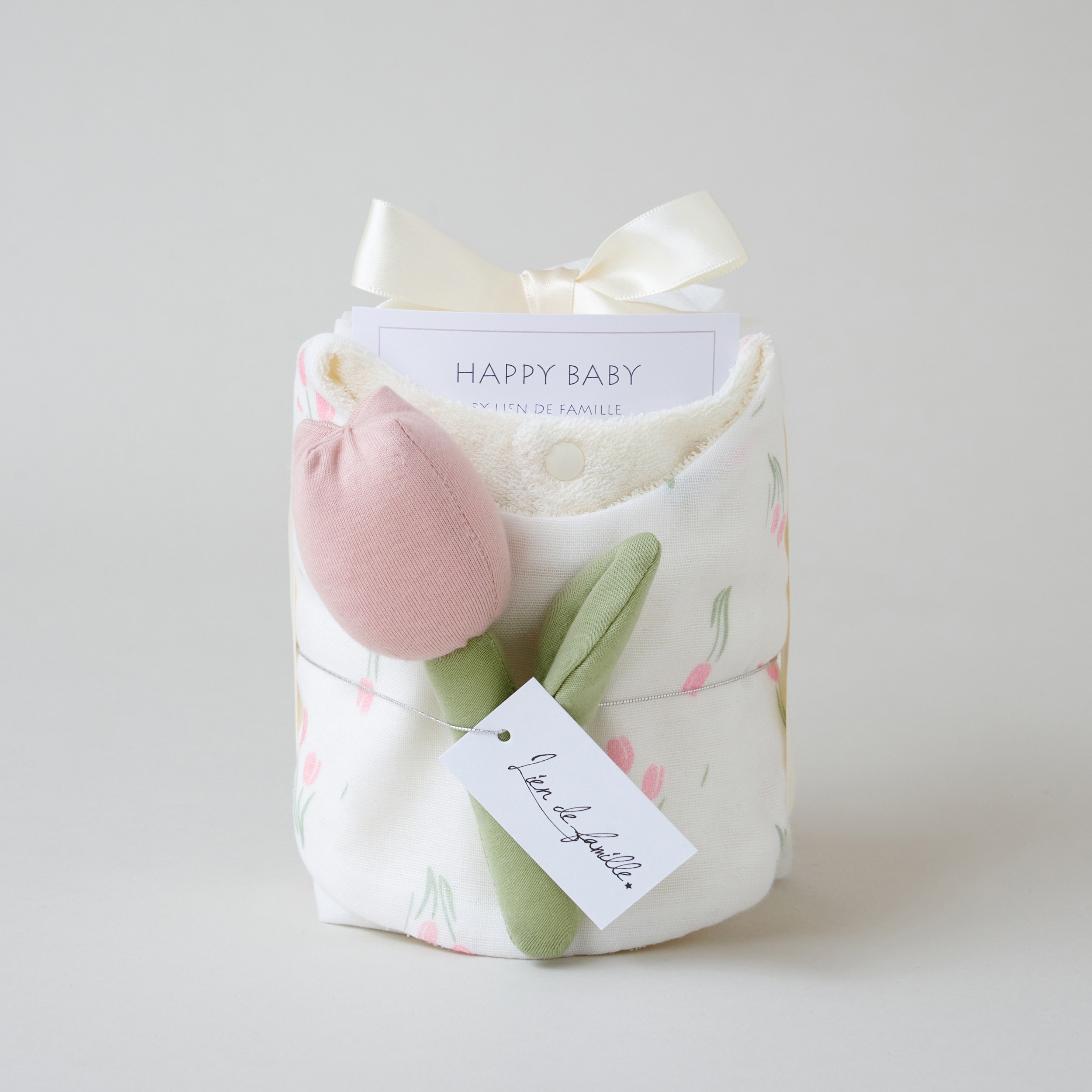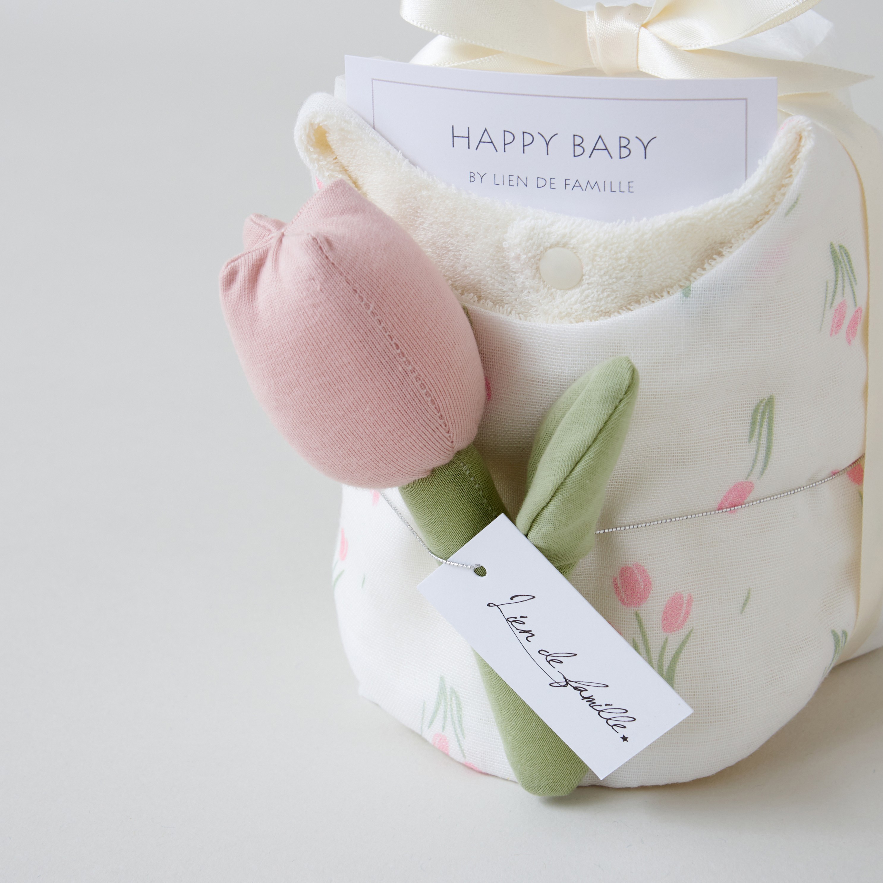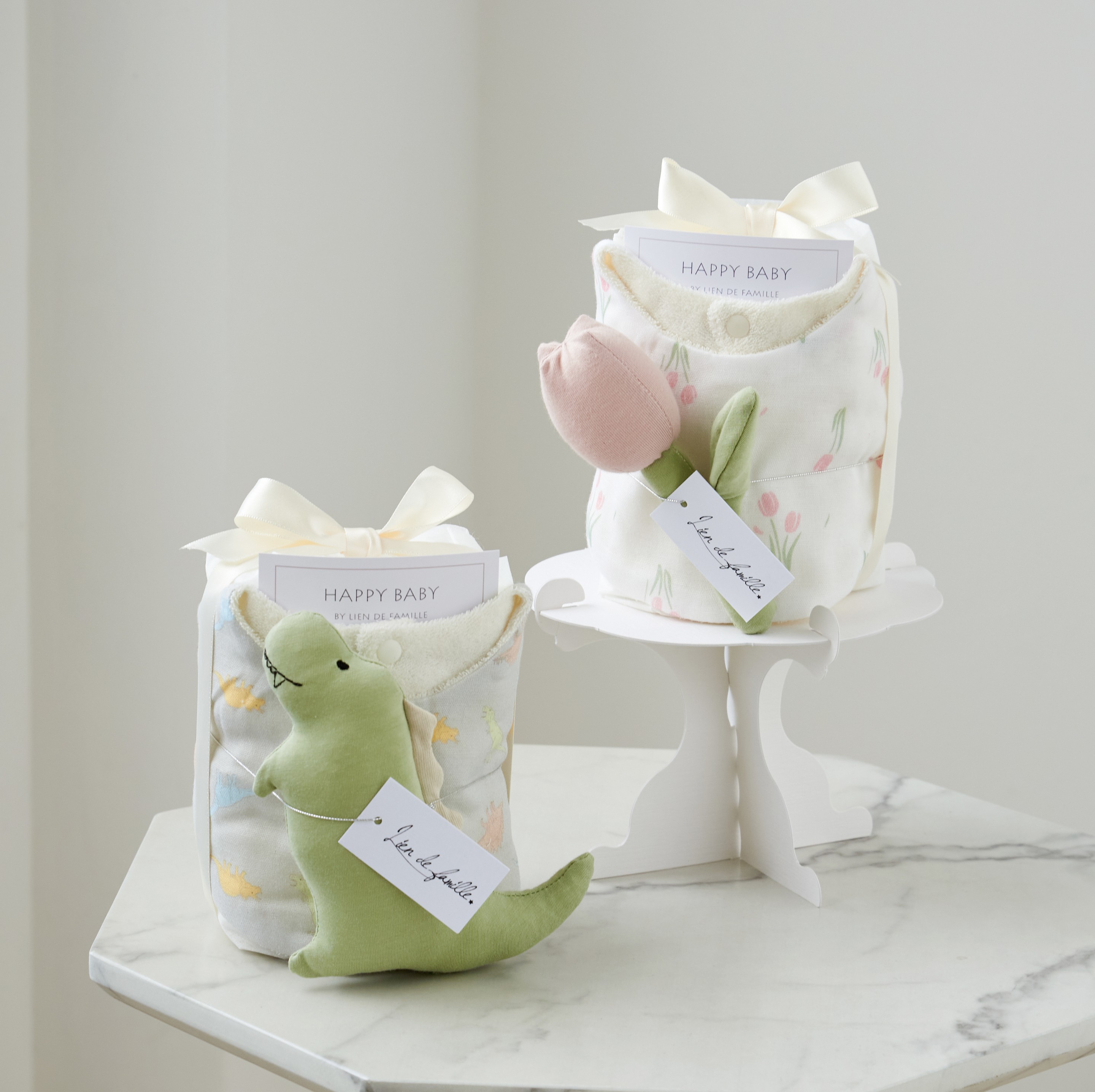 ありそうでなかったサイズ感のおむつケーキ。Lien de familleらしいナチュラルなデザインのケーキです。セット内容はスタイ・ラトル・Sサイズのおむつ5枚。定番のまぁるいスタイは日常使いしやすい綿100%で、裏地はパイル素材なので吸水性もあります。ソフトラトルは赤ちゃんが持ちやすい大きさで、優しい音色の鈴が入っています。スタイ、ラトル、どちらも日本製です。