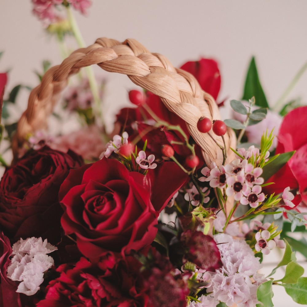 カンボジアの小さな村でひとつひとつ手作りのカゴは、丁寧に編み込まれてあたたかみを感じる作品。取っ手の編み方や長さまでこだわっています。 そんなカゴに、たっぷりのレッドの生花をあしらえばココロが弾みます。