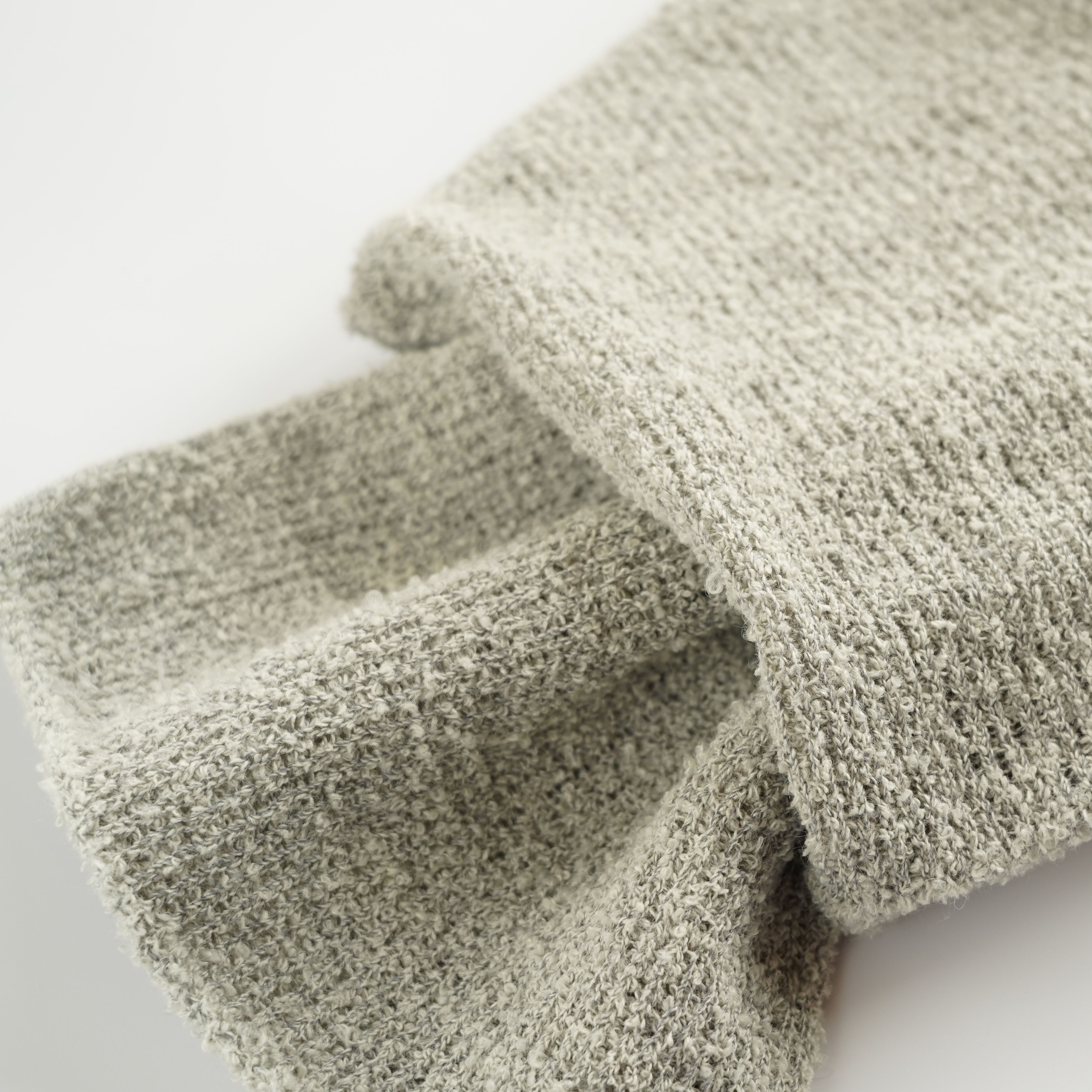 | 素材 | シルク40%、アクリル33%、ナイロン18%、ウール9% ※首元に当たる内側はシルク100%の糸を使用 |