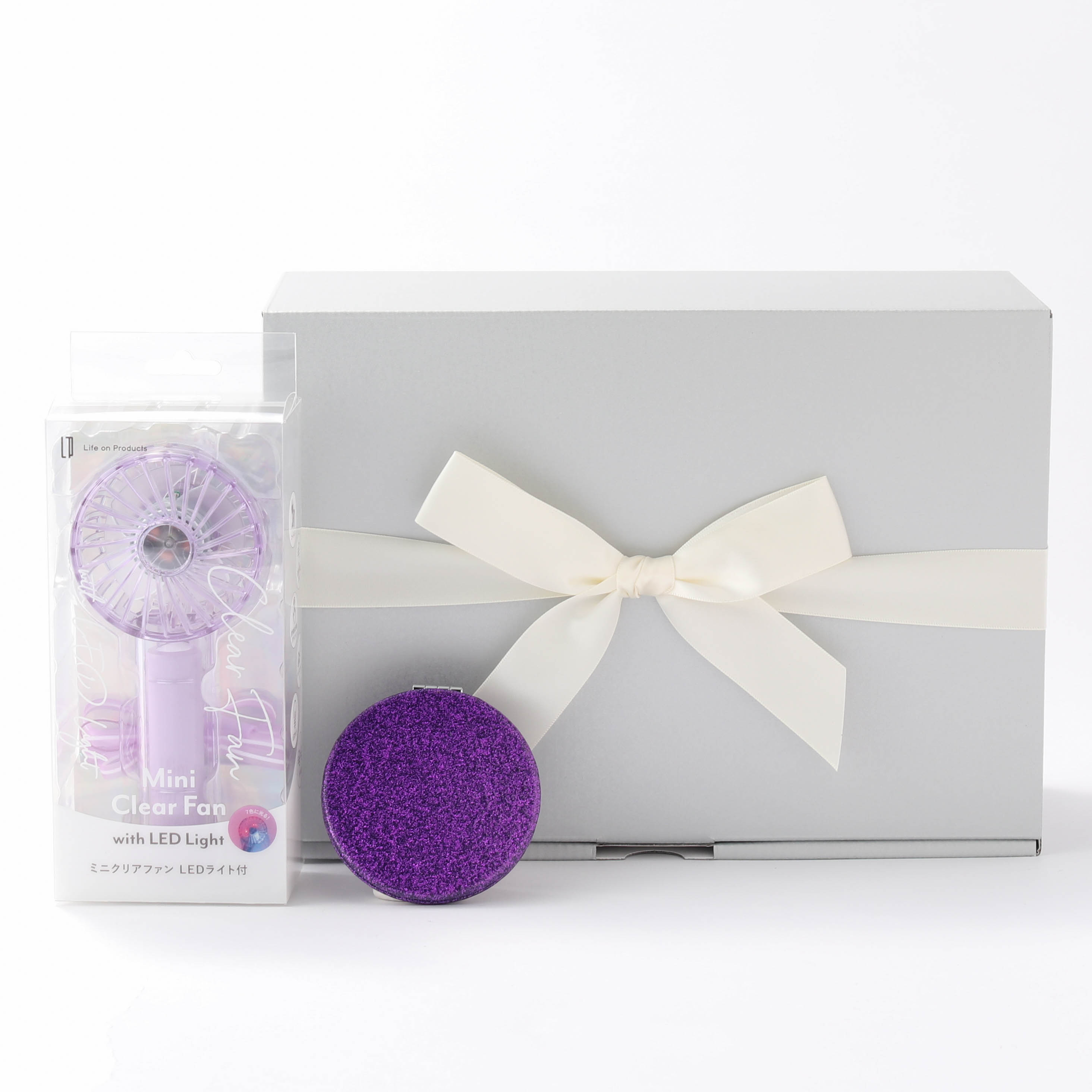 名入れができるコンパクトミラーとクリアなデザインが写真映えするハンディファンのセット。夏の“必需品”に名入れで特別感をプラスした贈り物です。ハンディファンは自動で7色に変わるLEDライト付で暗い場所でも楽しくお使いいただけます。