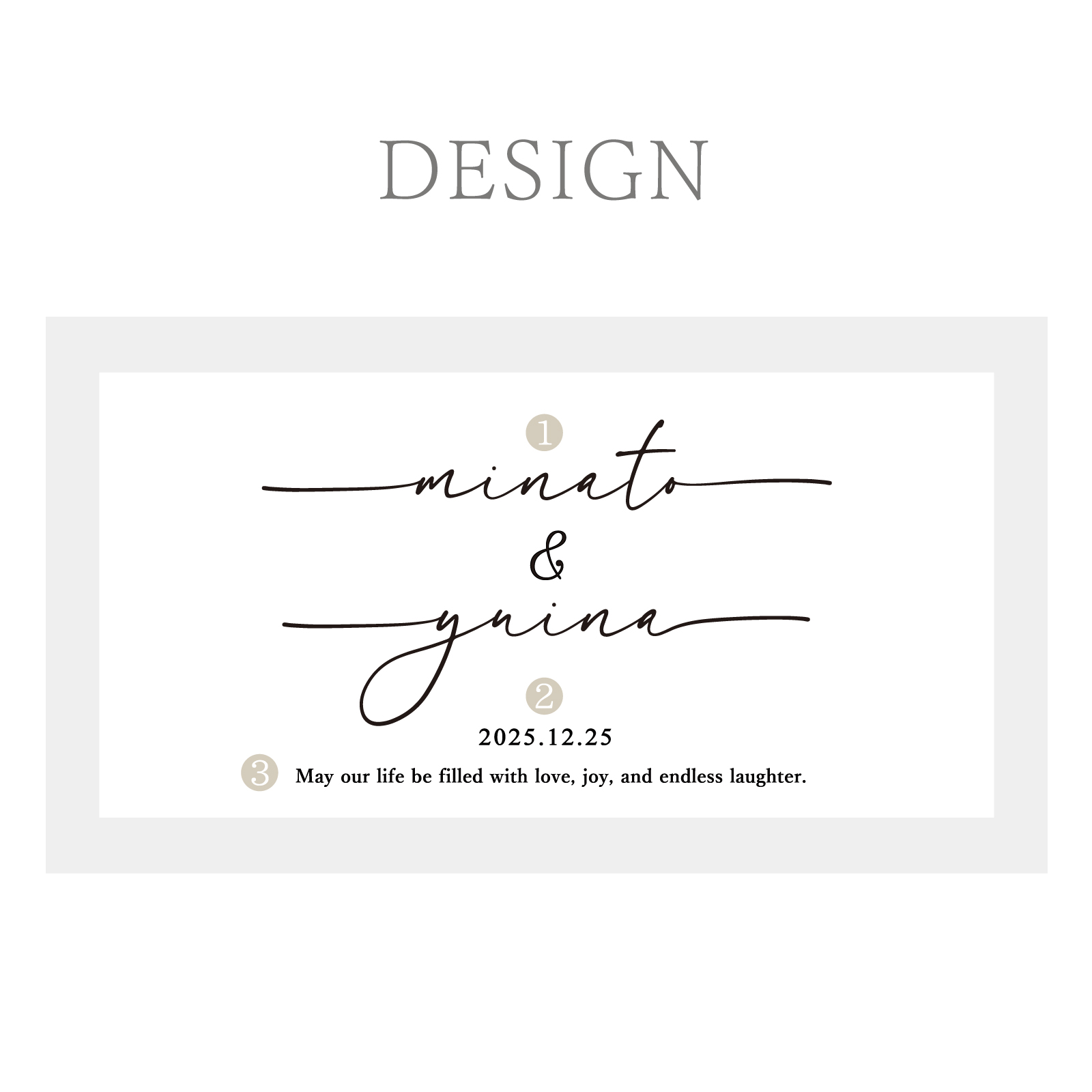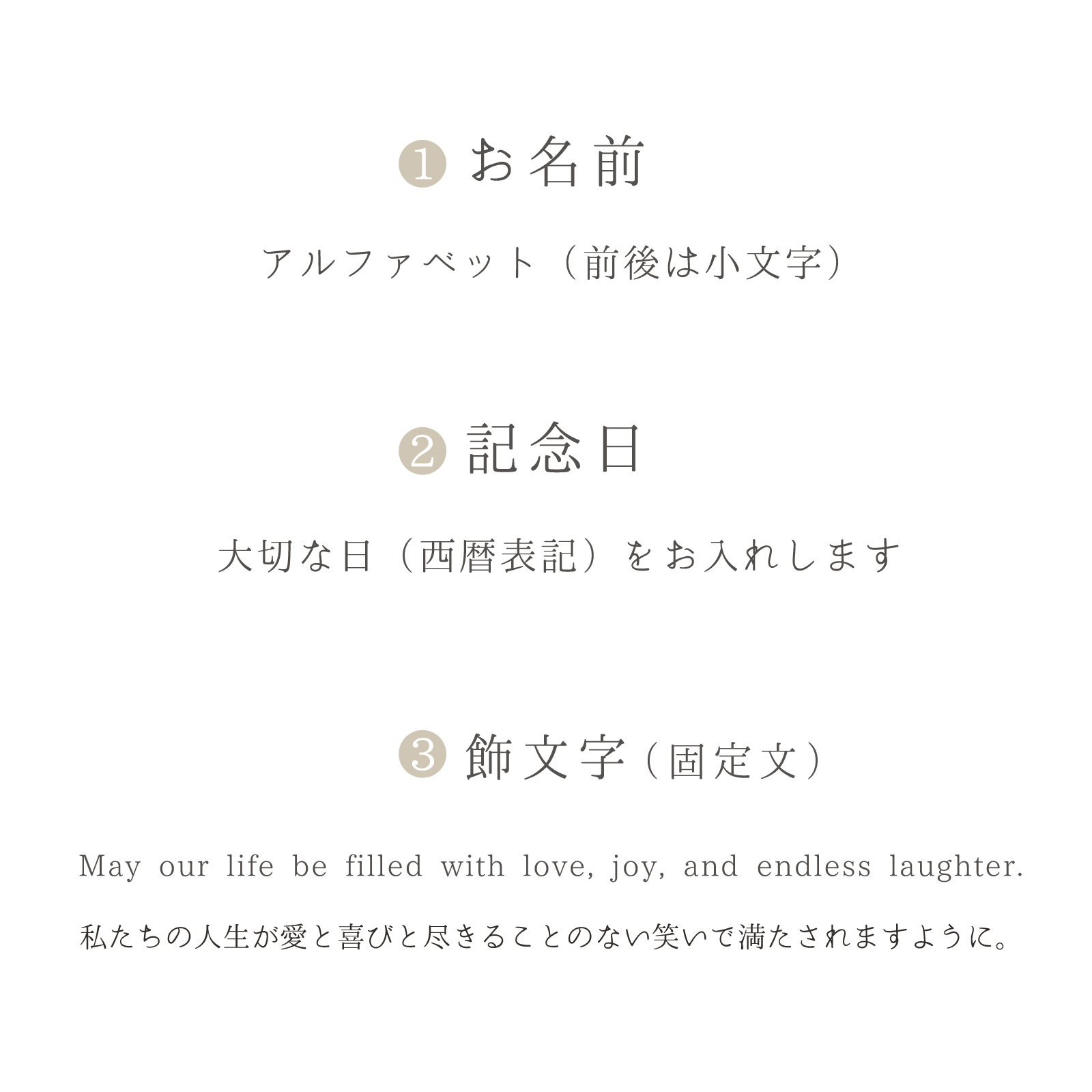 「お名前」と「記念日」を入力するだけで、世界にひとつのオリジナルギフトが完成します。 既製品にはない特別感と、これからの幸せを願う気持ちを込めて。 大切な方へ、心あたたまるギフトをお届けします。 ※③飾文字は固定文となります。