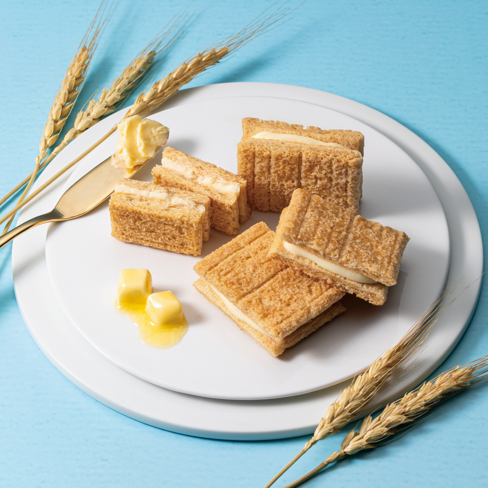 独自ブレンドで焼きあげた香ばしいシリアル生地にバターを贅沢にかけあわせる特別製法で、新定番のおいしさを実現したホワイトショコラサンドです。