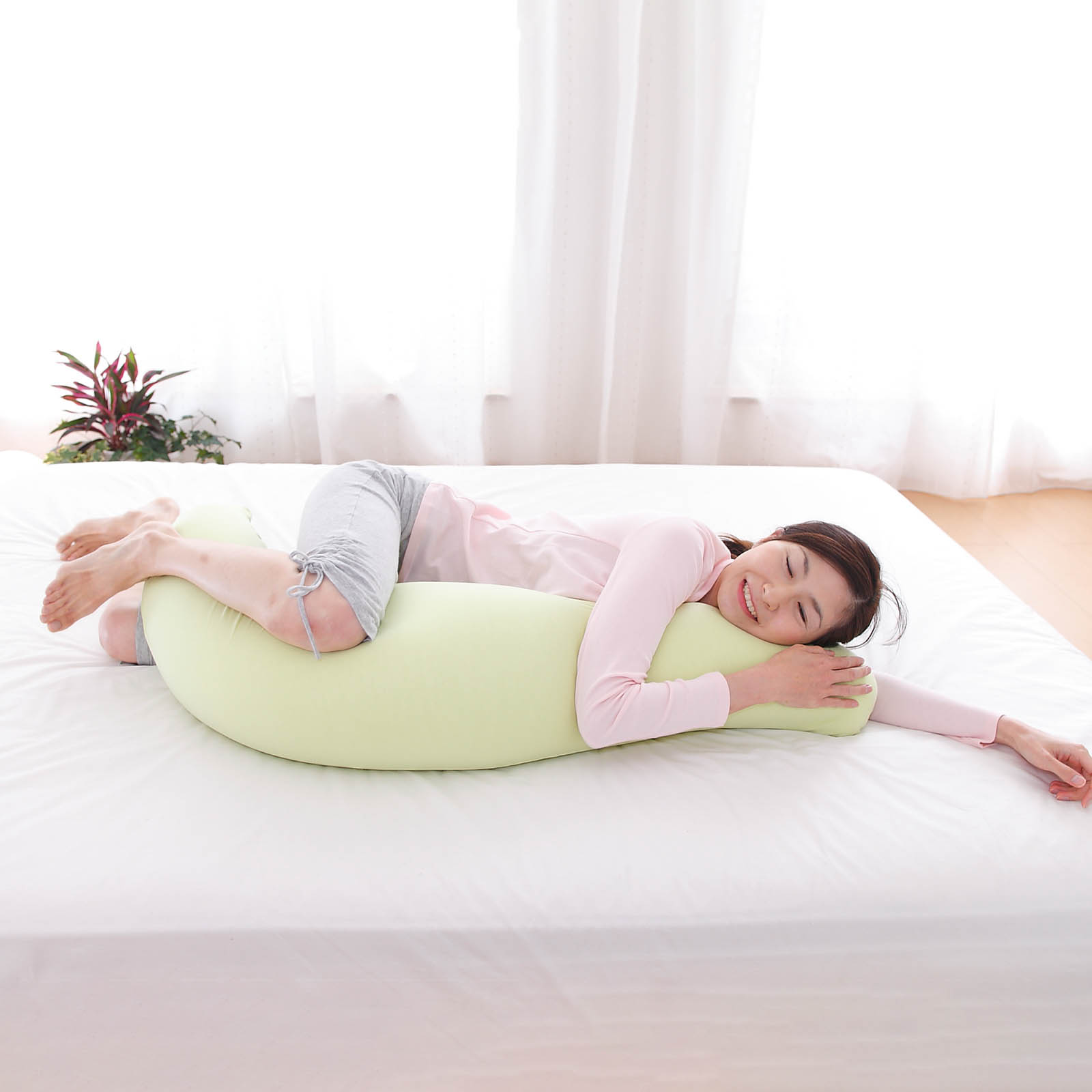 カラダのラインに沿った流線型のデザインで抱きごこちも抜群。 この形状と、自由自在に変形する中素材の組み合わせの相乗効果により、体型や寝姿勢に合わせてフィットするのです。 だから、高さ調整が難しい・煩わしいと感じる方にも、お手軽にお使いいただけます。 横寝・横向き寝のサポートはもちろん、お腹が大きくなった妊婦さんのシムス位の姿勢もサポート。