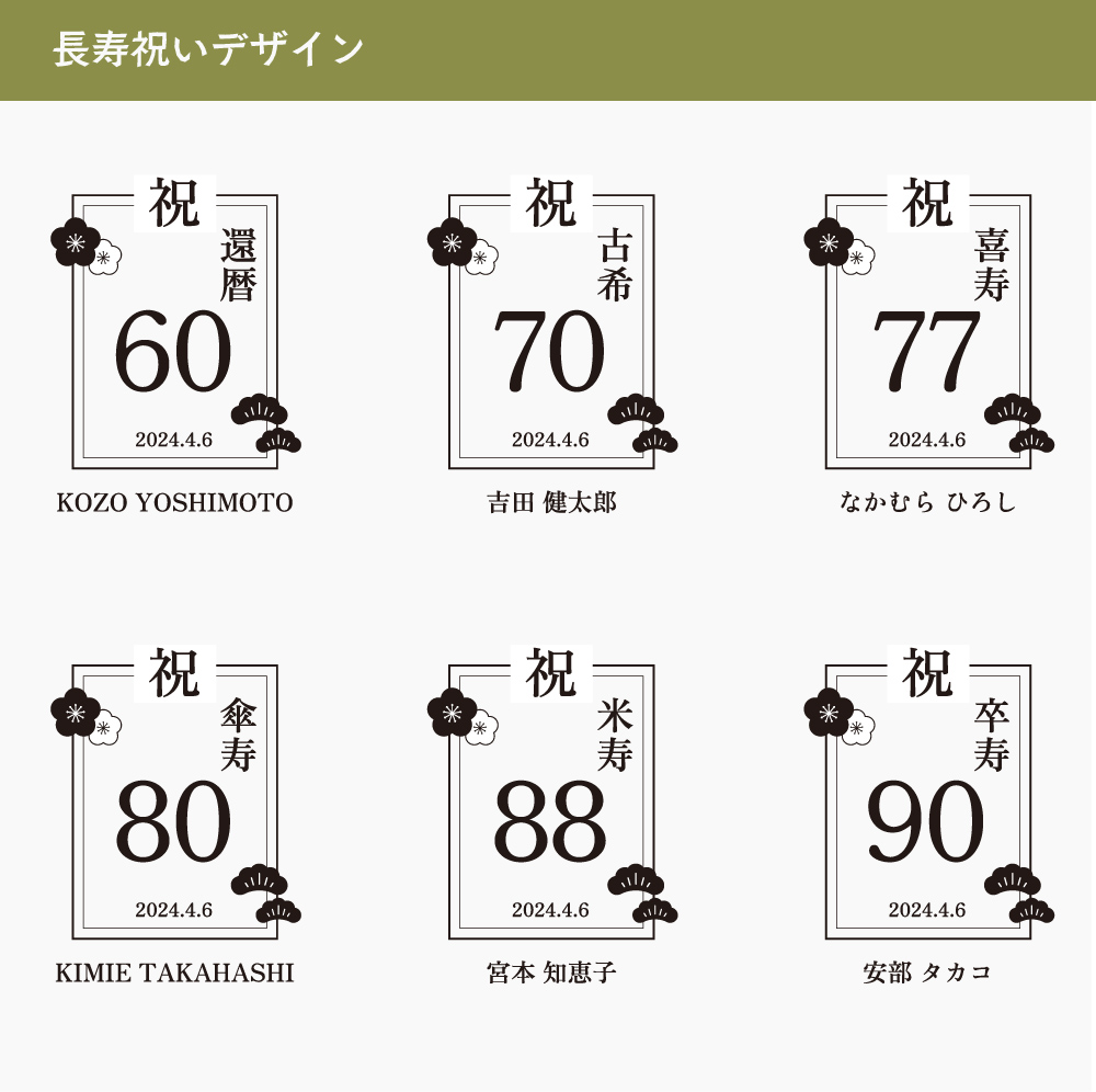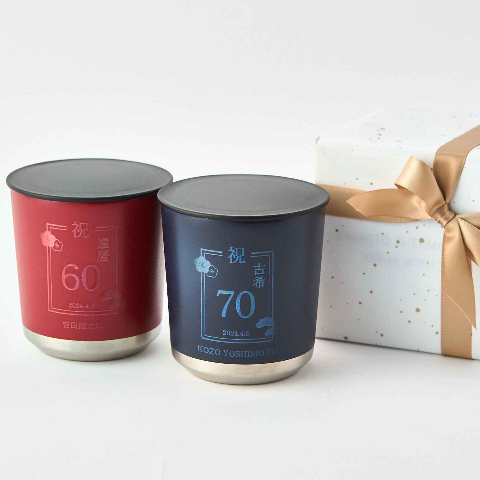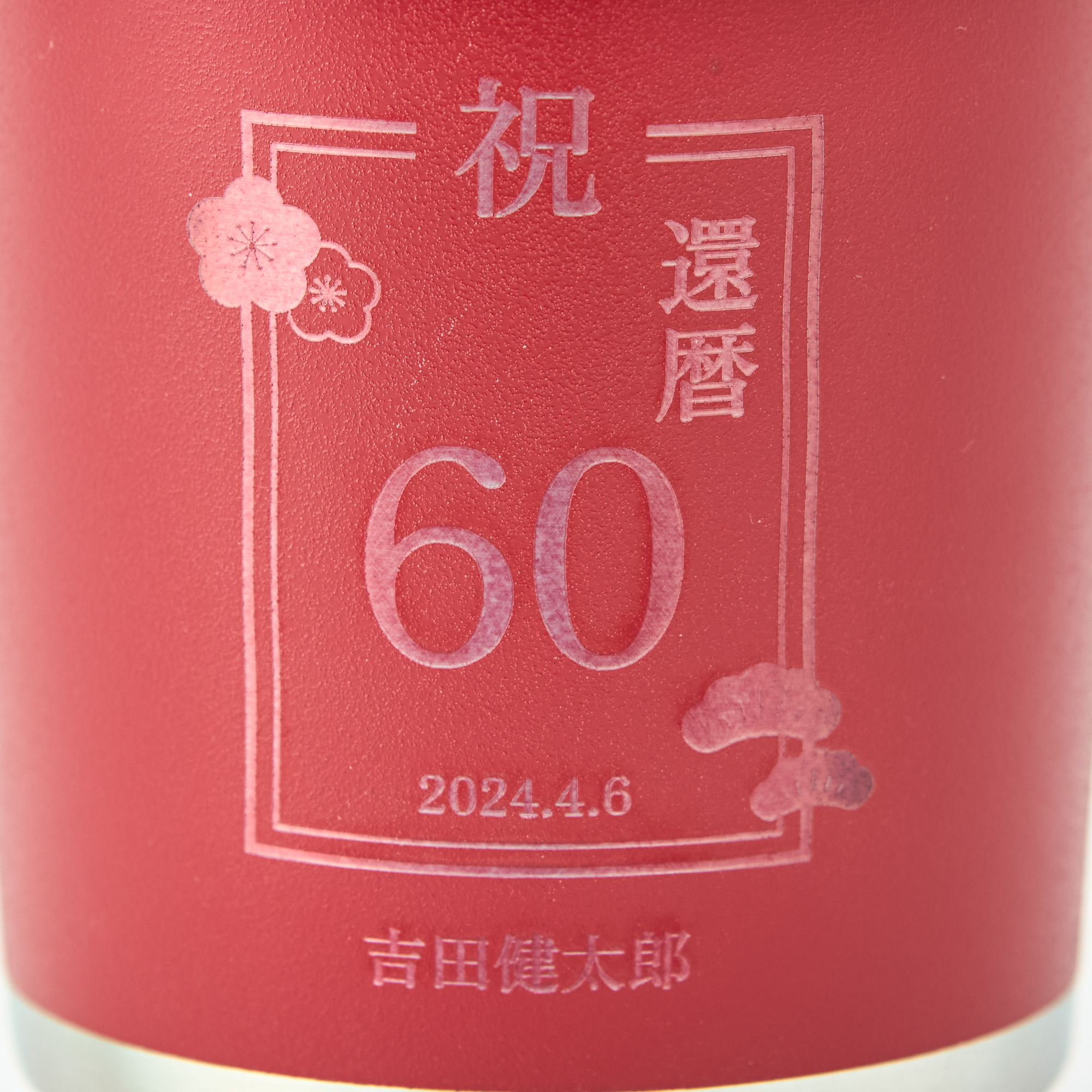 タンブラーには長寿を祝うデザインと日付・お名前が刻印可能。 デザインは6種類ご用意しております。 「還暦」「古希」「喜寿」「傘寿」「米寿」「卒寿」 お祝いの記念ギフトとしておすすめです。