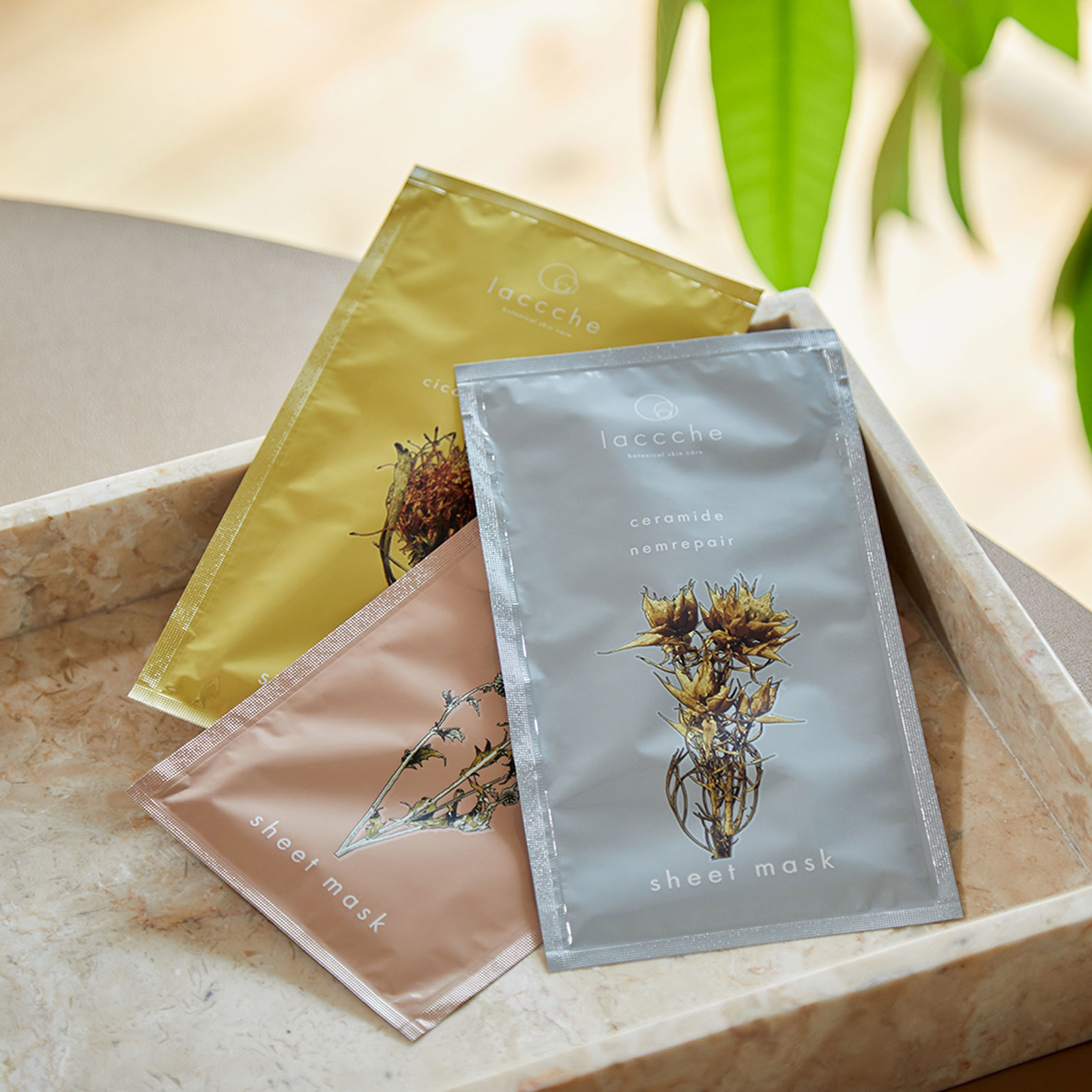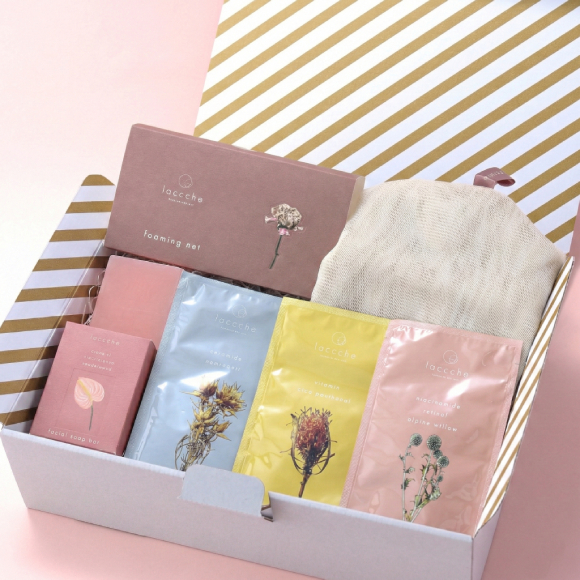 2025年春に誕生したボタニカルスキンケアのブランド「laccche(ラッシェ)」の美容液成分40%配合フェイス用石鹸&濃密泡の泡だてネット&植物由来のボタニカル成分で構成された肌にやさしいシートマスクのセット。極上の使用感、心地よい香りと共に、リラックスタイムを彩ります。