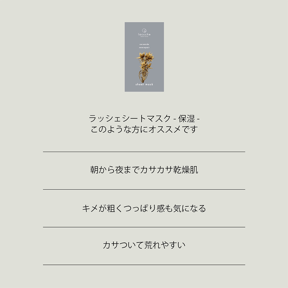 2025年春に誕生したボタニカルスキンケアのブランド「laccche」 あっという間に過ぎていくまいにちを一生懸命すごしている人の暮らしを、少しでも豊かで心安らぐものにしたい。 そんな想いから“laccche(ラッシェ)”は生まれました。 仕事に、家事に、現代を生きる人々の毎日はあっという間に過ぎていきます。 そんなあなたのいちにちの終わりに、 ほっと癒される時間をつくるお手伝いができたら… そんな想いで誕生したのが“laccche(ラッシェ)”。 極上の使用感、心地よい香りと共に、リラックスタイムを彩ります。