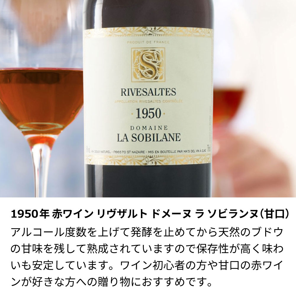 ワイン種別:赤ワイン(甘口)蔵出し 容量:750ml 産地:フランス ラングドック=ルーション地方 リヴザルト地区AOC ブドウ品種:グルナッシュ100% 生産者:リヴザルト ドメーヌ ラ ソビランヌ 南フランス産ブドウのグルナッシュで造られるワインです。 こちらは普通の醸造と異なる「ヴァン ド ナチュレル」といわれる、ワインの発酵途中でアルコールを加え発酵を止めて、天然の葡萄の甘味を保ったまま熟成させるという製法で作られています。 作り年によってブドウの品質や長期熟成により色合いが赤色から琥珀(こはく)色になることがありますが、味のムラがほとんどなく仕上がり、味わいは熟成されたブドウの豊かな甘さにドライフルーツを凝縮したような味わいを持っています。また、アルコール度数が高いため抜栓してから1週間くらい味が変わらずにゆっくり楽しむことが出来るのが特徴です。