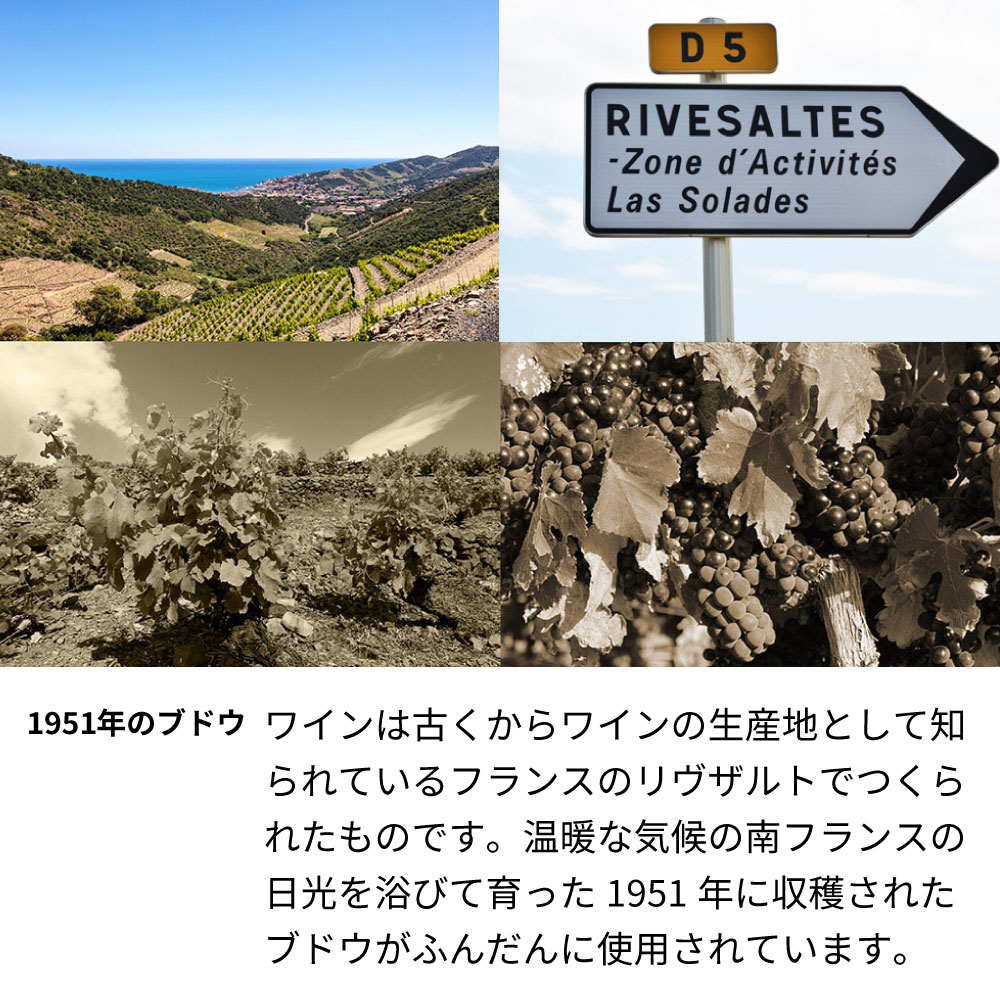 ワイン種別:赤ワイン(甘口 / 蔵出し) 産地:フランス ラングドックルーション地方 ブドウ品種:グルナッシュ100% アルコール16% 生産者:ドメーヌ ラソビランヌ こちらのヴィンテージワインは、長期間熟成されて保存されたワインとなります。 リヴザルトは普通の醸造と異なる「ヴァン ド ナチュレル」といわれる、ワインの発酵途中でアルコールを加え発酵を止めて、天然の葡萄の甘味を保ったまま熟成させるという製法で作られています。 作り年によってブドウの品質や長期熟成により色合いが赤色から琥珀(こはく)色になることがありますが、味のムラがほとんどなく仕上がり、味わいは熟成されたブドウの豊かな甘さにドライフルーツを凝縮したような味わいを持っています。また、アルコール度数が高いため抜栓してから1週間くらい味が変わらずにゆっくり楽しむことが出来るのが特徴です。