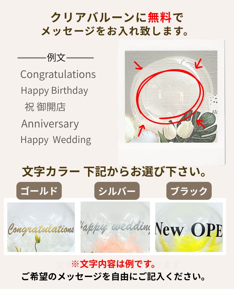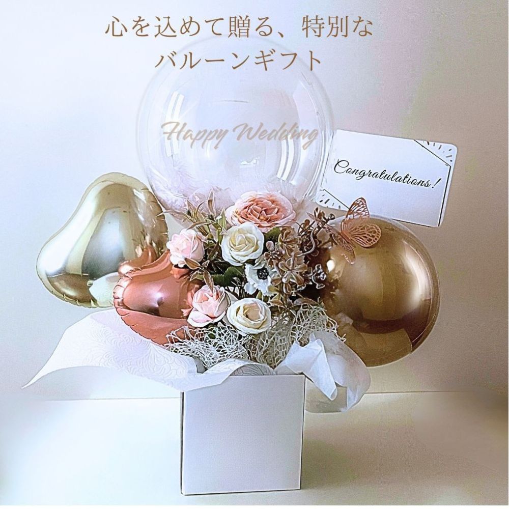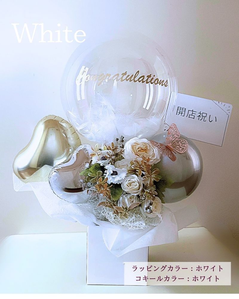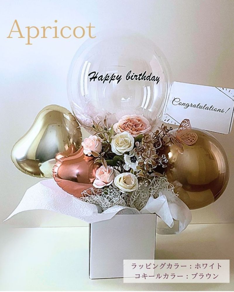 蝶々が付いた可憐でエレガントなバルーンギフトです。カラーホワイトは上品な印象を、カラーピンクは甘くて華やかな印象を、カラーアプリコットは優雅で優しい印象を。シチュエーションに合わせてカラーをお選びいただけます。バルーンに名入れも可能ですので、特別なギフトになる事間違いなしです。