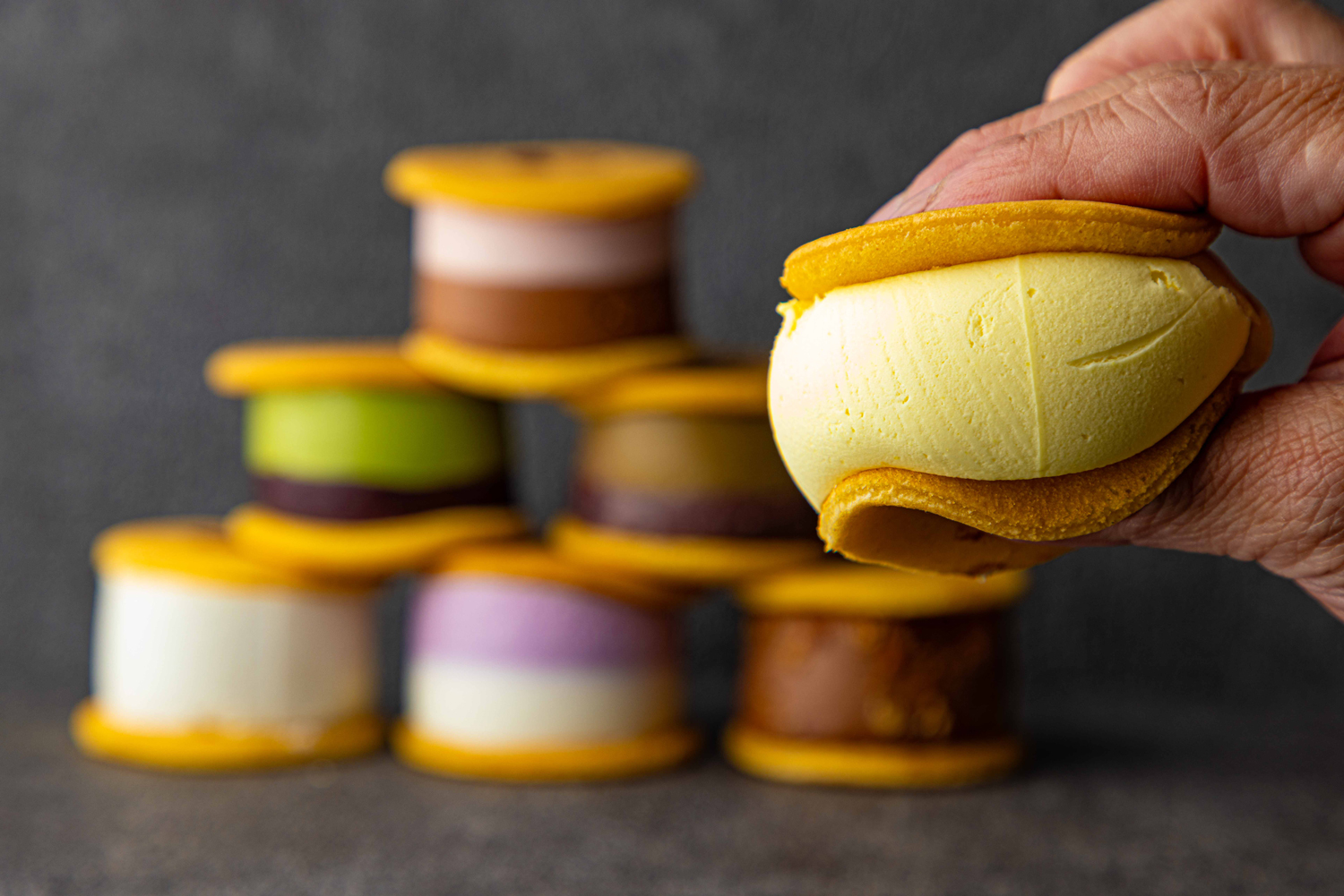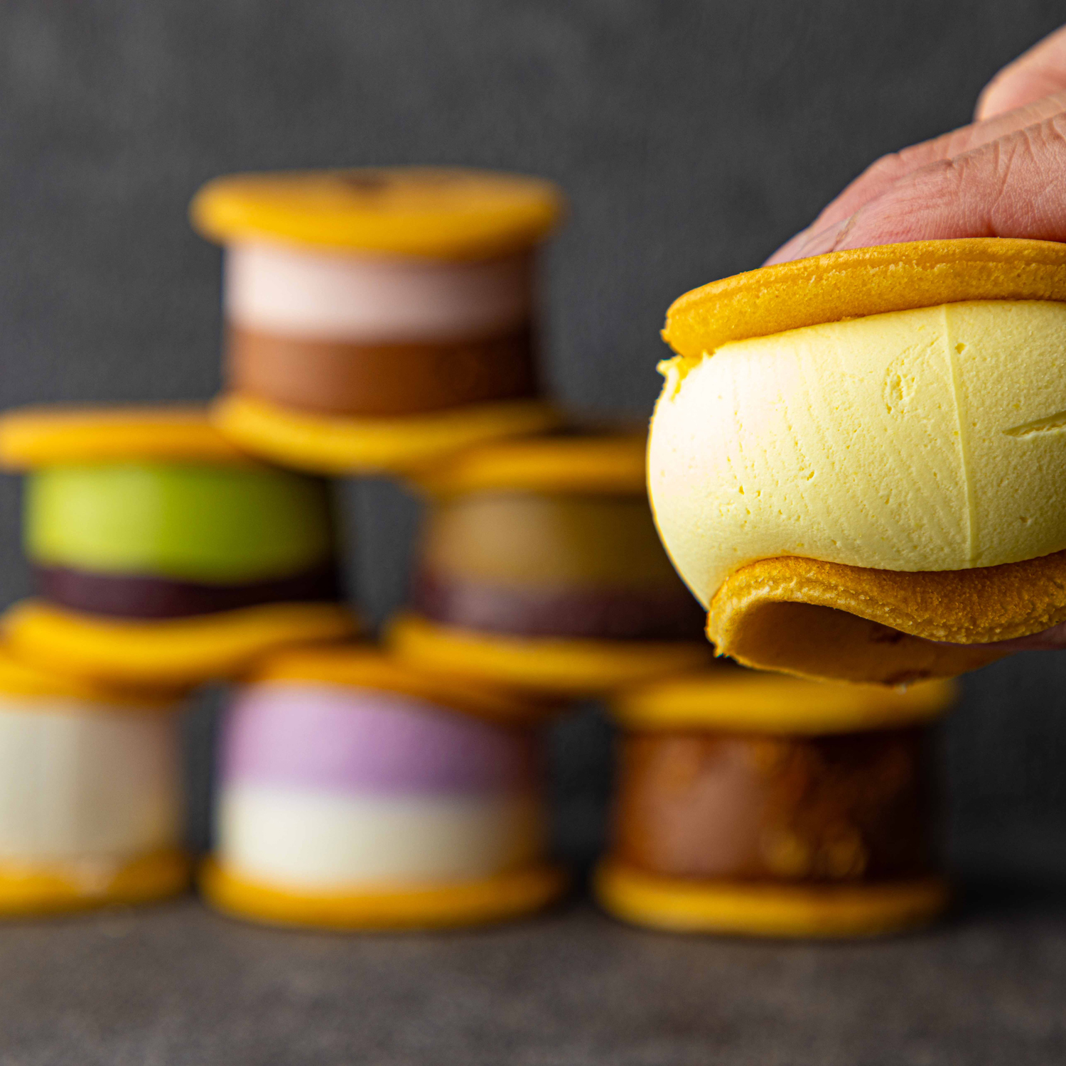 大口注文・法人のお問い合わせはこちら「冷やして美味しい」「冷やしてるのにもちもち」をコンセプトに開発した生どら焼き「和かろん。」こだわりの自家製の皮はお餅のようなもっちり感。中にはたっぷりのあんこや味のバリエーションも豊富なムースが挟まっています。一口食べればお口いっぱいに幸せが広がります。