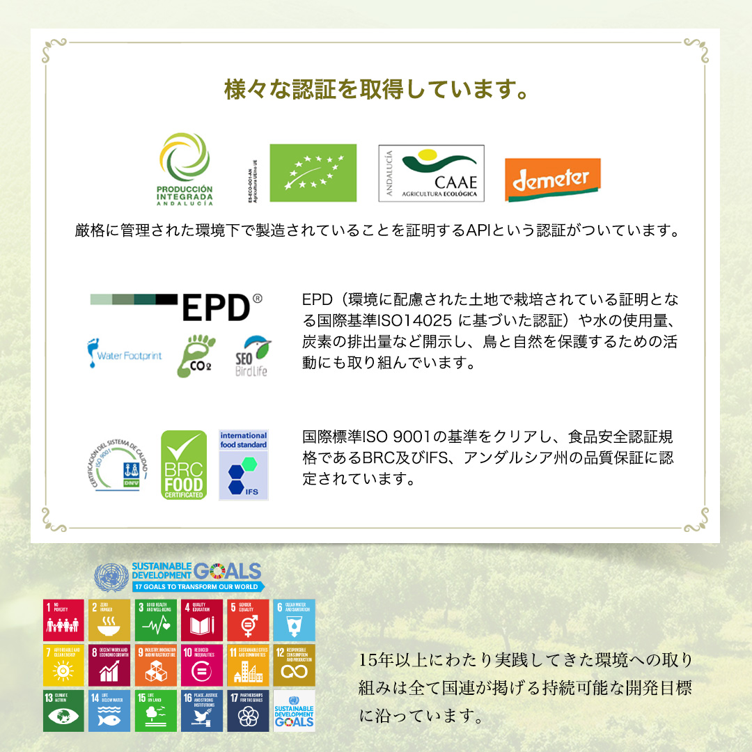 スペイン南部、アンダルシア地方で18世紀から家族代々、何世代にも渡って本物のオリーブオイル造りに携わりオリーブの栽培と手入れから、酸化を防ぐ為の収穫、搾油、保管、ぞして樹の保護まで、全ての工程で最高の状態を保つめ全行程を100%自社で管理しています。 収穫後3時間以内にコールドプレスをし、酸度は0.12%。