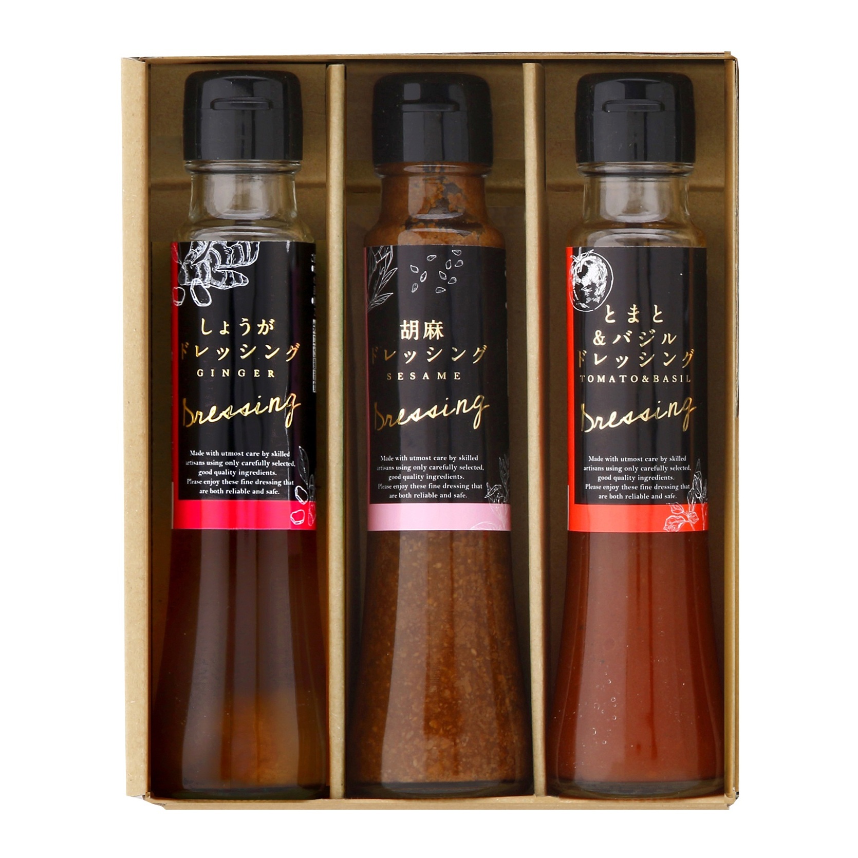 | 内容量/数量 | しょうがドレッシング100ml、胡麻ドレッシング100ml、とまと&バジルドレッシング100ml×各1本 |