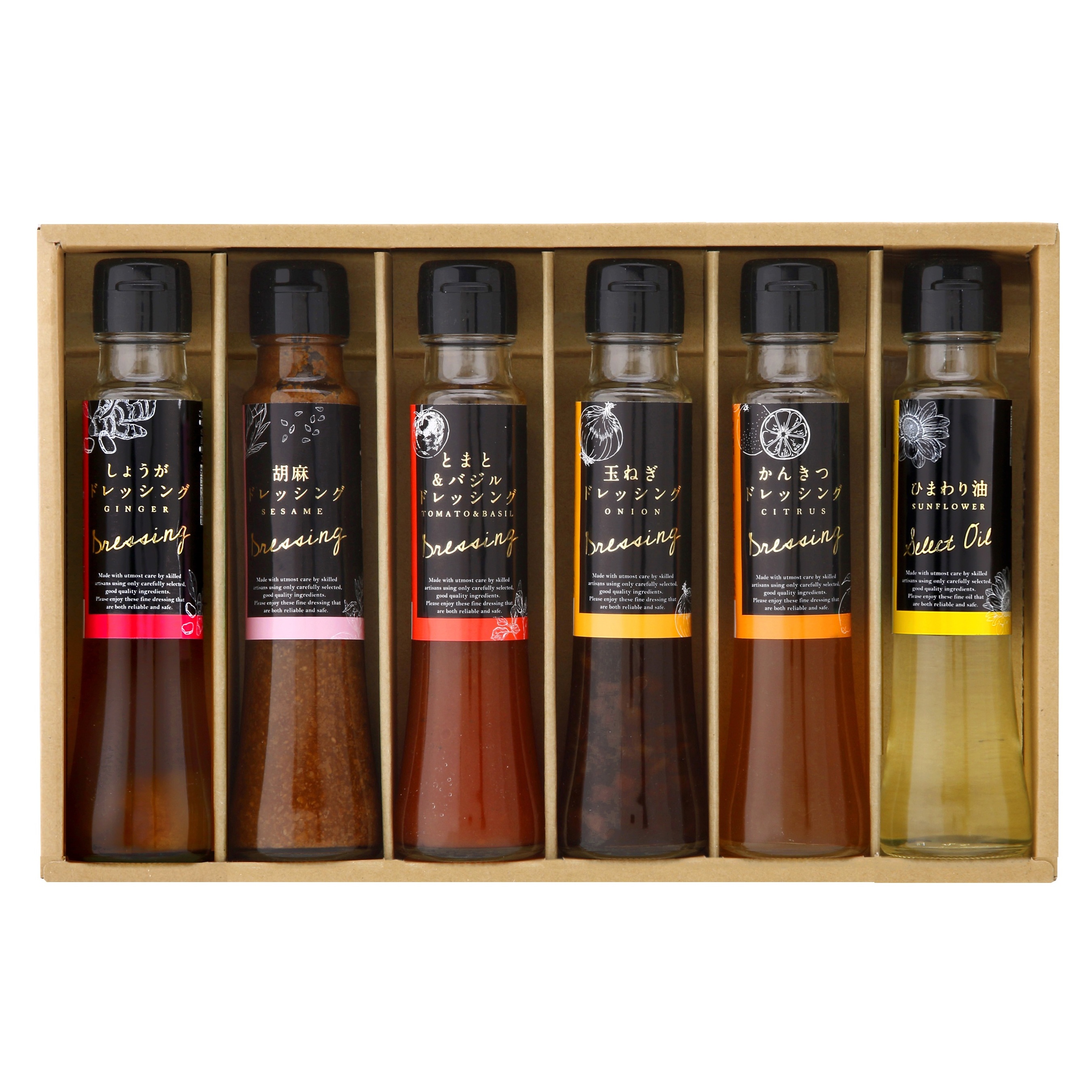 | 内容量/数量 | しょうがドレッシング100ml、胡麻ドレッシング100ml、とまと&バジルドレッシング100ml、玉ねぎドレッシング100ml、かんきつドレッシング100ml、ひまわり油90g×各1本 |