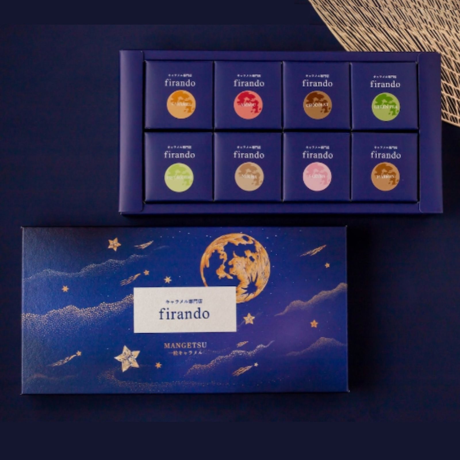 人気のMANGETSU petitがひとくちサイズで新登場。煌めくネイビーの満月夜パッケージに小箱が8つ並びます。九州素材の人気フレーバー8種セットで、初めての方にもぴったり。開ける瞬間、舌に乗せる瞬間、どの瞬間もワクワクと楽しくなるデザインです。