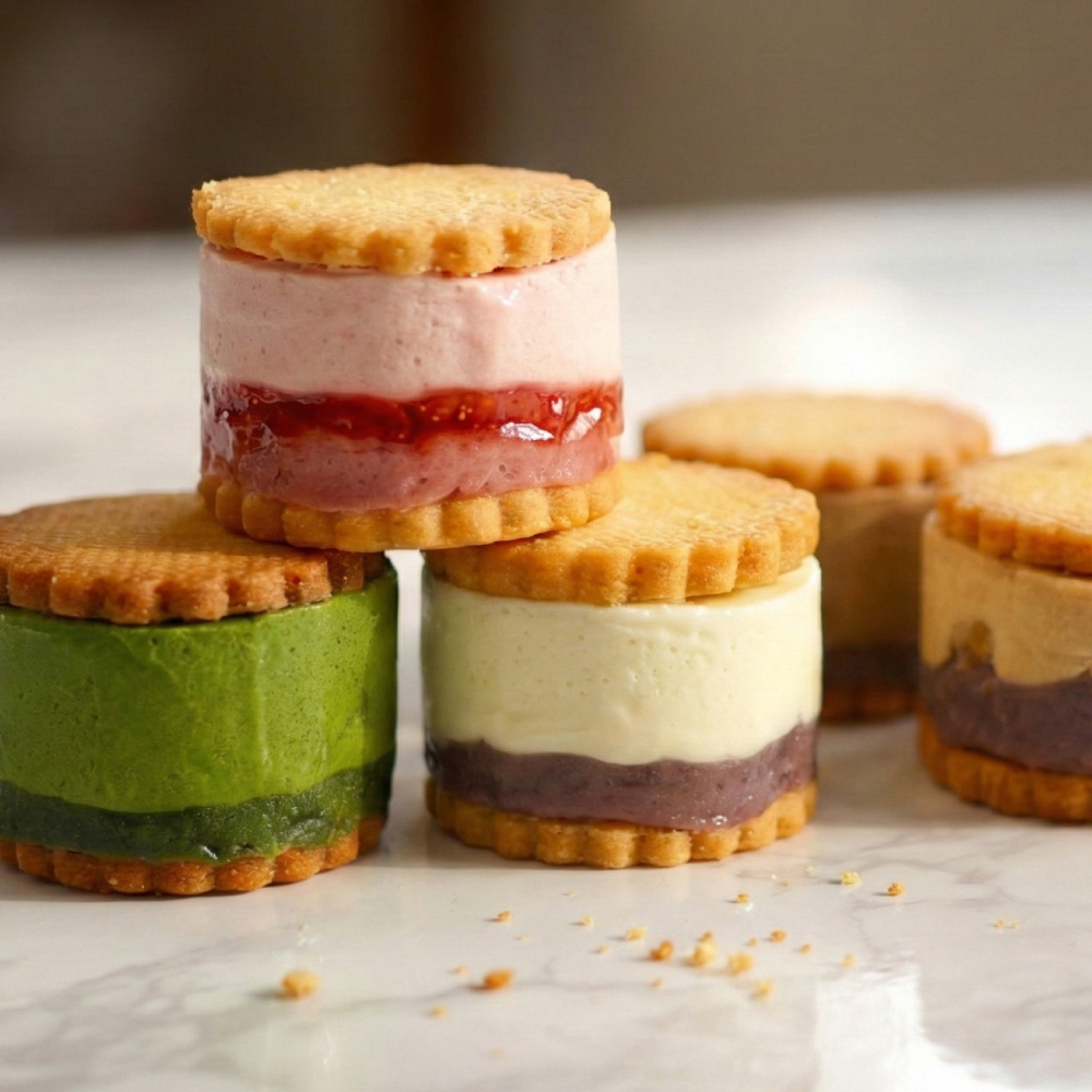 サクほろ食感の自家製バターサブレで、もちもちのおもちと、あん、なめらかなバタークリームをサンド。 あんバター、いちご、アールグレイ、抹茶バターなど、彩り豊かなフレーバーを詰め合わせており、それぞれが異なる素材の風味と絶妙なバランスで仕上げられています。