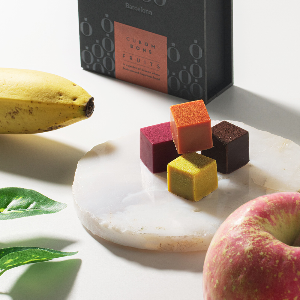 果実の美味しさを閉じ込めた、キューブ型のボンボンショコラ4種セット。 バナナとパッションフルーツ、リンゴとシナモン、柚子、ラズベリーとバジルなど、他にはないユニークなフレーバーです。 口どけなめらかなフルーツのガナッシュと、チョコレートの奥深い味わいをお楽しみいただけます。