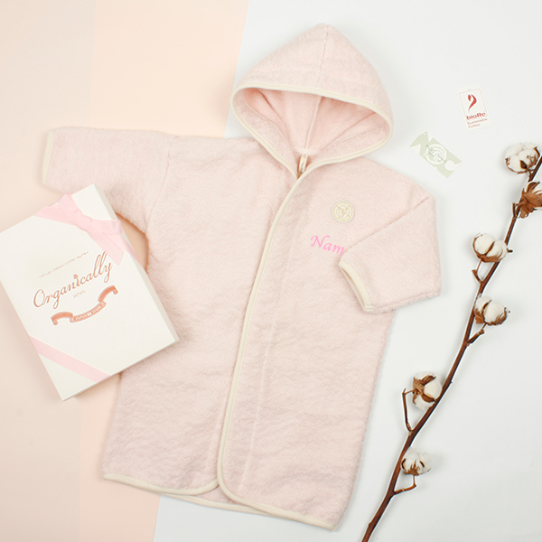 大口注文・法人のお問い合わせはこちらお風呂あがりの湯冷め解消!ママも助かる出産祝いに不動の人気NO.1ベビーバスローブ。赤ちゃんのために混じり気のない本物のオーガニックコットンを使用し、安全なパイル地を開発しました パイル生地はオーガニックコットン本来の柔らかさを保つため、タオルづくりで行われるたくさんの化学的な処理を極力行わず、天然由来の石鹸で仕上げを行うことでお肌の弱い赤ちゃんにも安心安全にご利用いただいております。 パパママが一生懸命考えた大切なお名前の入った贈物はきっと特別な出産祝いになるはずです。 バスローブはお風呂上がりにぱっと赤ちゃんに着せられ、その間にママが身支度することができるので大変便利です。生後1ヶ月から36ヶ月(3歳)過ぎまでと長くお使いいただけます。 このバスローブには厳しいNOC(日本オーガニックコットン流通機構)の製品認証基準を取得しており、その証となるタグが付いています。 また、ギフト先にもオーガニカリー商品のこだわりが伝わるように、フェアトレードで作られたことやNOC認証のオーガニックコットンを使用していることを記載したものを一緒にお送りしています。