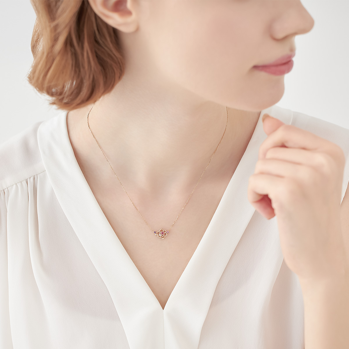 6月の誕生花「愛情」の花言葉を持つバラ。 ピンクゴールドコーティングの透け感のある花びらが胸元で軽やかに輝くネックレス。