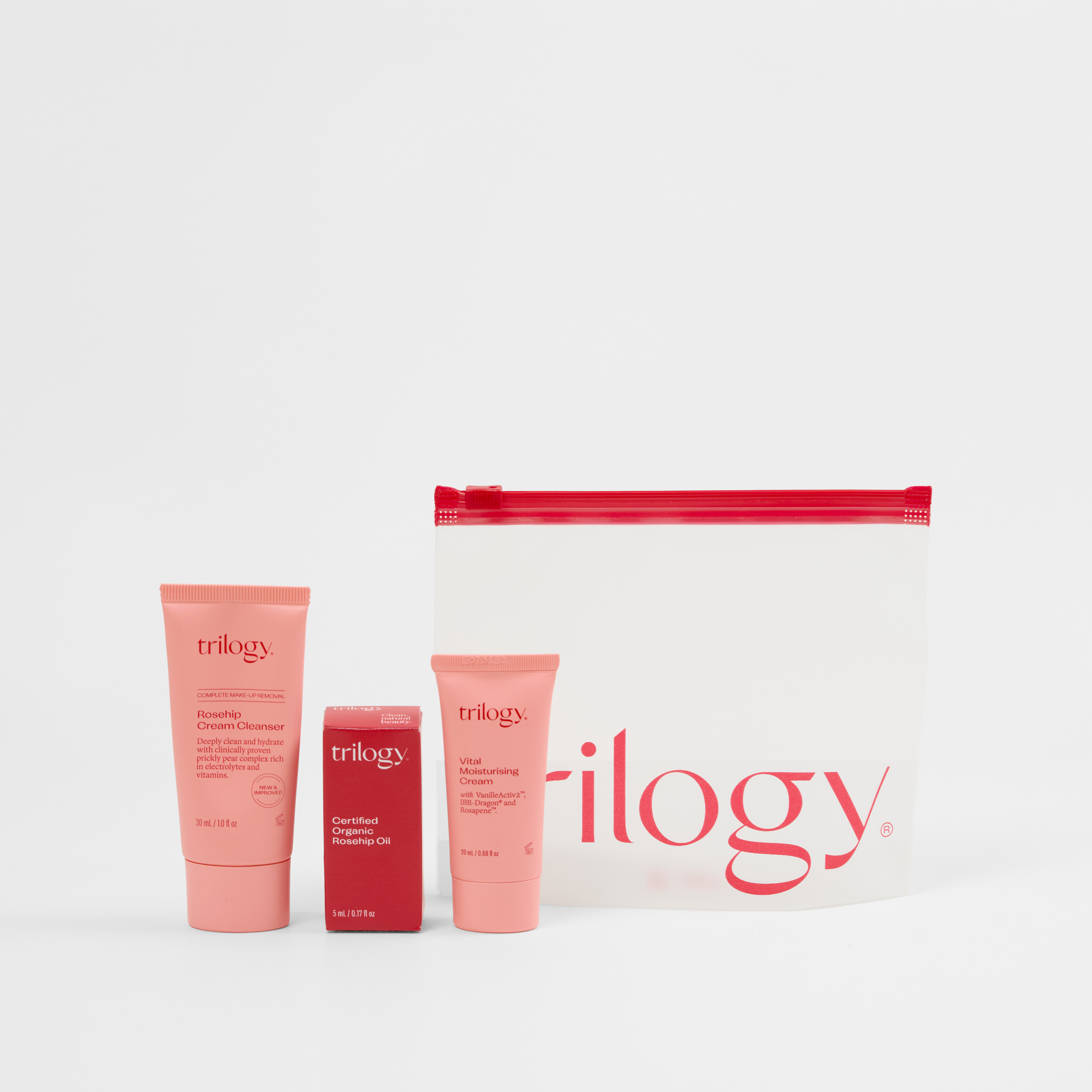 大口注文・法人のお問い合わせはこちらコスメキッチン ベストコスメアワード1位受賞*¹のRHクレンジングクリーム、ブランド売上No.1*²のローズヒップオイル*³、すっと馴染んでしっかり潤う人気のバイタルモイスチュアライジングクリームを、たっぷり約1週間お試しいただけます。 毛穴の目立たない*⁴、つるんとモッチモチなゆでたまご肌へ。 *¹2024年上半期コスメキッチン ベストコスメアワード 洗顔&クレンジング部門1位 *²2023年9月~2024年7月 trilogy内の累計売上金額(自社知らべ) *³ カニナバラ種子油/保湿成分 *⁴毛穴の汚れを落とし、うるおいで乾燥毛穴を目立たなくすること