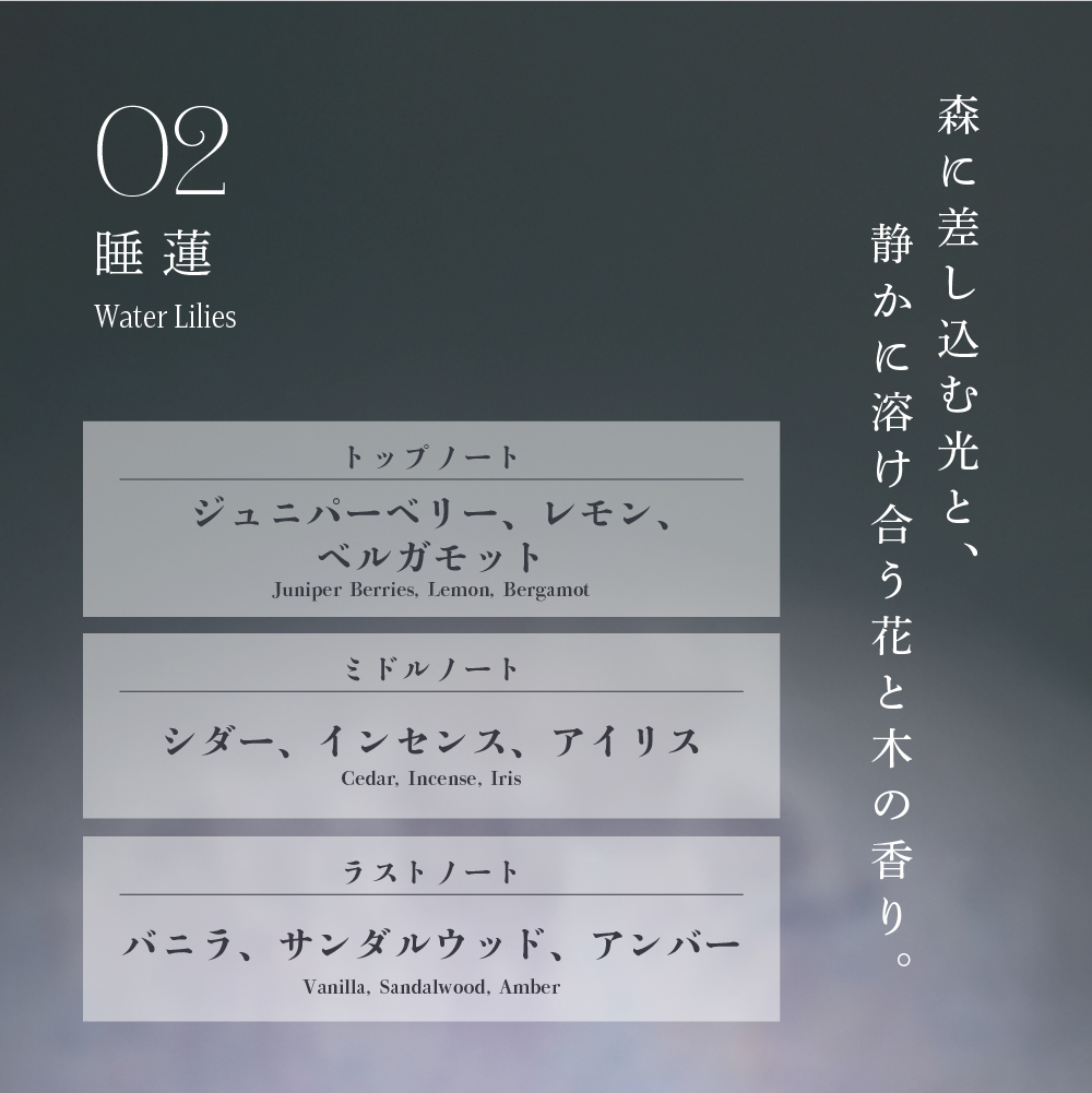 澄んだジュニパーベリーとレモンが静けさを誘い、アイリスが優しく重なります。余韻は、凛としたバニラとサンダルウッドの甘さとぬくもりを届けます。