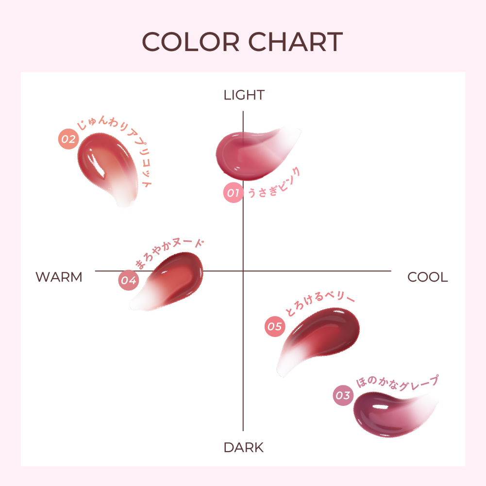 | 成分 | 【01 うさぎピンク】 ポリイソブテン、テトライソステアリン酸ペンタエリスリチル、トリメリト酸トリトリデシル、イソノナン酸イソノニル、水添ポリデセン、水添(スチレン/イソプレン)コポリマー、フェニルトリメチコン、ジメチルシリル化シリカ、メントール、酸化チタン、カプリリルグリコール、メントングリセリンアセタール、乳酸メンチル、トリイソステアリン酸ポリグリセリル-2、香料、赤202、エチルヘキシルグリセリン、酢酸トコフェロール、酸化鉄、黄5、トリエトキシカプリリルシラン、メドウフォーム種子油、カニナバラ果実油、オオミテングヤシ果実油、トリ(カプリル酸/カプリン酸)グリセリル、パルミチン酸エチルヘキシル、テトラ(ジ-t-ブチルヒドロキシヒドロケイヒ酸)ペンタエリスリチル、ポリヒドロキシステアリン酸、ヒマシ油、アミノプロピルトリエトキシシラン、ヒアルロン酸Na、トリベヘニン、水添ヒマシ油、トコフェロール、イソステアリン酸ソルビタン、キバナオランダセンニチエキス、乳酸、パルミトイルトリペプチド-1 【02 じゅんわりアプリコット】 ポリイソブテン、テトライソステアリン酸ペンタエリスリチル、トリメリト酸トリトリデシル、イソノナン酸イソノニル、水添ポリデセン、水添(スチレン/イソプレン)コポリマー、フェニルトリメチコン、ジメチルシリル化シリカ、メントール、カプリリルグリコール、メントングリセリンアセタール、乳酸メンチル、トリイソステアリン酸ポリグリセリル-2、酸化チタン、酸化鉄、香料、エチルヘキシルグリセリン、酢酸トコフェロール、赤202、黄5、メドウフォーム種子油、カニナバラ果実油、オオミテングヤシ果実油、トリ(カプリル酸/カプリン酸)グリセリル、トリエトキシカプリリルシラン、パルミチン酸エチルヘキシル、テトラ(ジ-t-ブチルヒドロキシヒドロケイヒ酸)ペンタエリスリチル、トリベヘニン、ヒマシ油、ヒアルロン酸Na、ポリヒドロキシステアリン酸、水添ヒマシ油、アミノプロピルトリエトキシシラン、トコフェロール、イソステアリン酸ソルビタン、キバナオランダセンニチエキス、乳酸、パルミトイルトリペプチド-1 【03 ほのかなグレープ】 ポリイソブテン、テトライソステアリン酸ペンタエリスリチル、トリメリト酸トリトリデシル、イソノナン酸イソノニル、水添ポリデセン、水添(スチレン/イソプレン)コポリマー、フェニルトリメチコン、ジメチルシリル化シリカ、メントール、トリイソステアリン酸ポリグリセリル-2、カプリリルグリコール、メントングリセリンアセタール、乳酸メンチル、酸化チタン、酸化鉄、香料、エチルヘキシルグリセリン、酢酸トコフェロール、赤227、赤202、赤226、赤104(1)、メドウフォーム種子油、カニナバラ果実油、オオミテングヤシ果実油、トリ(カプリル酸/カプリン酸)グリセリル、トリエトキシカプリリルシラン、パルミチン酸エチルヘキシル、テトラ(ジ-t-ブチルヒドロキシヒドロケイヒ酸)ペンタエリスリチル、トリベヘニン、ヒマシ油、ポリヒドロキシステアリン酸、ヒアルロン酸Na、アミノプロピルトリエトキシシラン、水添ヒマシ油、トコフェロール、イソステアリン酸ソルビタン、キバナオランダセンニチエキス、ジステアルジモニウムヘクトライト、乳酸、炭酸プロピレン、パルミトイルトリペプチド-1 【04 まろやかヌード】 ポリイソブテン、テトライソステアリン酸ペンタエリスリチル、トリメリト酸トリトリデシル、イソノナン酸イソノニル、水添ポリデセン、水添(スチレン/イソプレン)コポリマー、フェニルトリメチコン、ジメチルシリル化シリカ、メントール、カプリリルグリコール、メントングリセリンアセタール、乳酸メンチル、トリイソステアリン酸ポリグリセリル-2、酸化鉄、酸化チタン、香料、エチルヘキシルグリセリン、酢酸トコフェロール、赤202、メドウフォーム種子油、カニナバラ果実油、オオミテングヤシ果実油、トリ(カプリル酸/カプリン酸)グリセリル、トリエトキシカプリリルシラン、パルミチン酸エチルヘキシル、テトラ(ジ-t-ブチルヒドロキシヒドロケイヒ酸)ペンタエリスリチル、トリベヘニン、ヒマシ油、ヒアルロン酸Na、水添ヒマシ油、ポリヒドロキシステアリン酸、アミノプロピルトリエトキシシラン、トコフェロール、イソステアリン酸ソルビタン、キバナオランダセンニチエキス、乳酸、パルミトイルトリペプチド-1 【05 とろけるベリー】 ポリイソブテン、テトライソステアリン酸ペンタエリスリチル、トリメリト酸トリトリデシル、イソノナン酸イソノニル、水添ポリデセン、水添(スチレン/イソプレン)コポリマー、フェニルトリメチコン、ジメチルシリル化シリカ、メントール、トリイソステアリン酸ポリグリセリル-2、カプリリルグリコール、メントングリセリンアセタール、乳酸メンチル、酸化鉄、酸化チタン、赤202、黄5、香料、エチルヘキシルグリセリン、酢酸トコフェロール、トリエトキシカプリリ