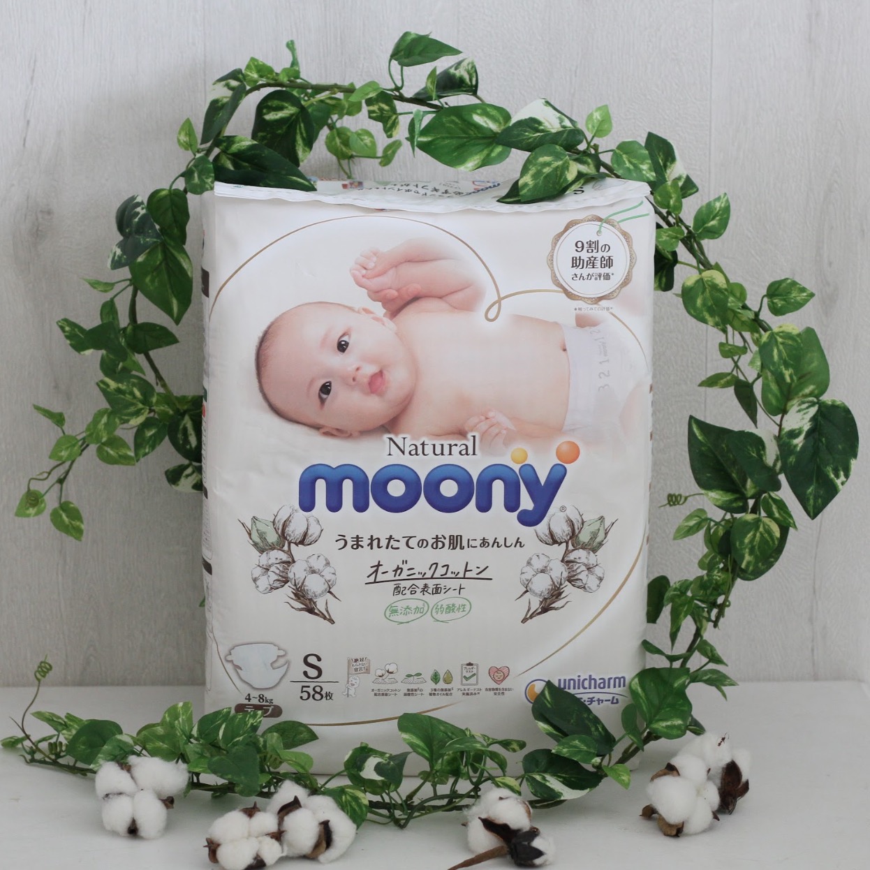 表面シートにオーガニックコットンを配合した「ムーニー低刺激で安心」。 おむつは今までにない柔らかな肌触りで赤ちゃんにもママにも優しい素材。 こだわり派の方に支持の高い安心・安全なプレミアムおむつです。 (ユニ・チャーム製造) 【使用おむつ】 ムーニー低刺激であんしん Sサイズ(4〜8kg) (Sサイズ おむつ使用枚数 8枚) ※Sサイズは平均的なお子様で5か月位までご使用になれます。