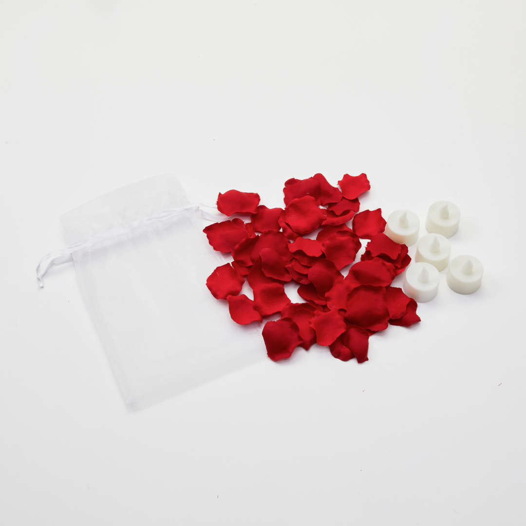 アートフラワーのレッドの花びらが約50枚と、コンパクトサイズのミニLEDライトが5つセットになっています。サプライズプレゼントとして思い出に残る演出ができます。