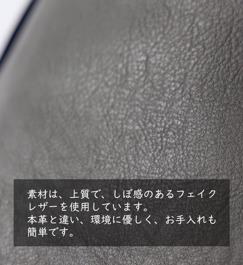 大口注文・法人のお問い合わせはこちらしっとりとした、しぼ感のある上質なフェイクレザーを使用。 本革のような高級感がありながら、水や汚れにも強くお手入れも簡単なので、天気を気にせず毎日気兼ねなくお使いいただけます。
