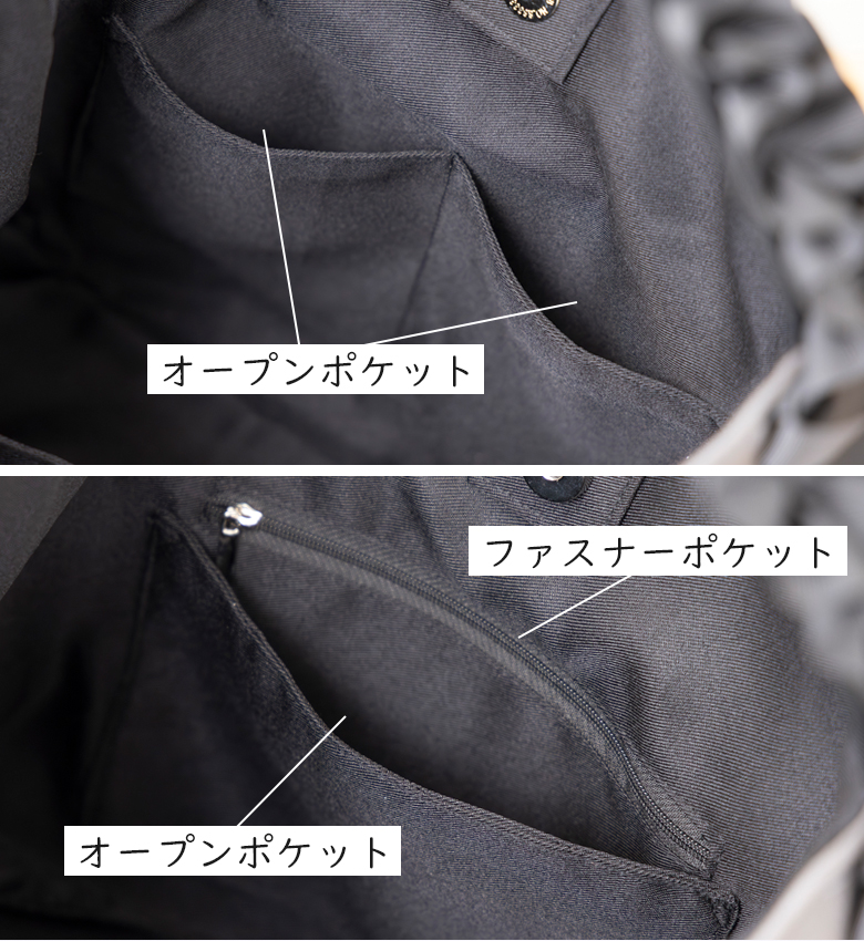 | 仕様 | ・開口部仕様:マグネット ・背面ファスナーポケット ・内側ポケット:オープンポケット×3/ファスナーポケット×1 |