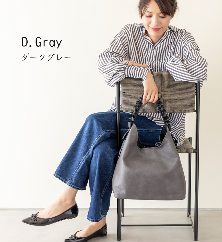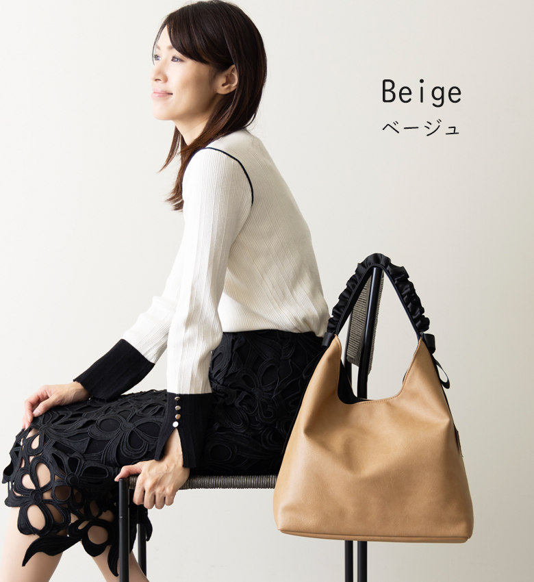 お出かけから通勤、通学までどんなシーンにもマッチする大人のシンプルバッグです。厳選したフェイクレザーは水や汚れに強く、お手入れも簡単なのでデイリーユースにもぴったり。どんな服にも合わせやすく甘すぎないフリルハンドルがさりげない存在感を演出してくれます。