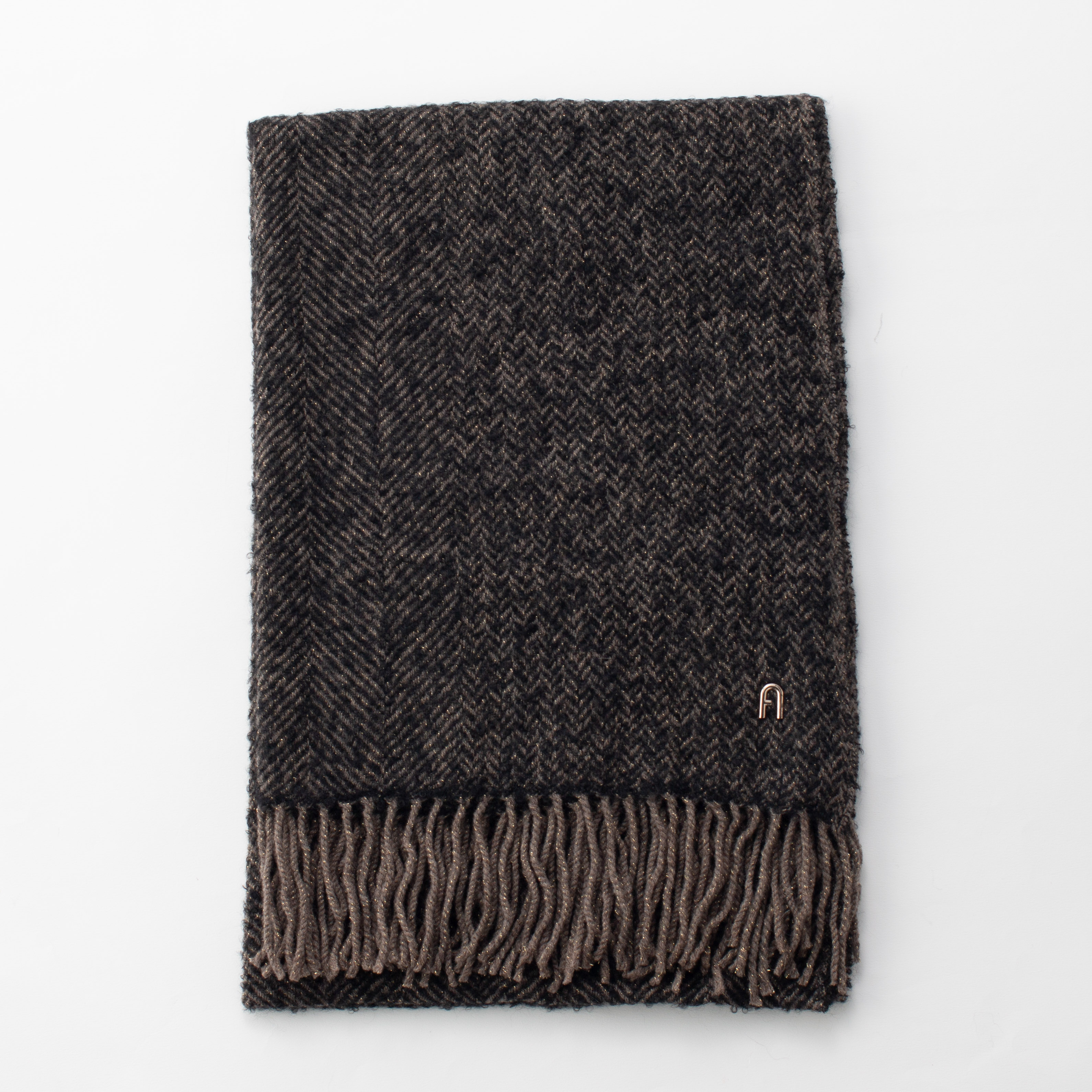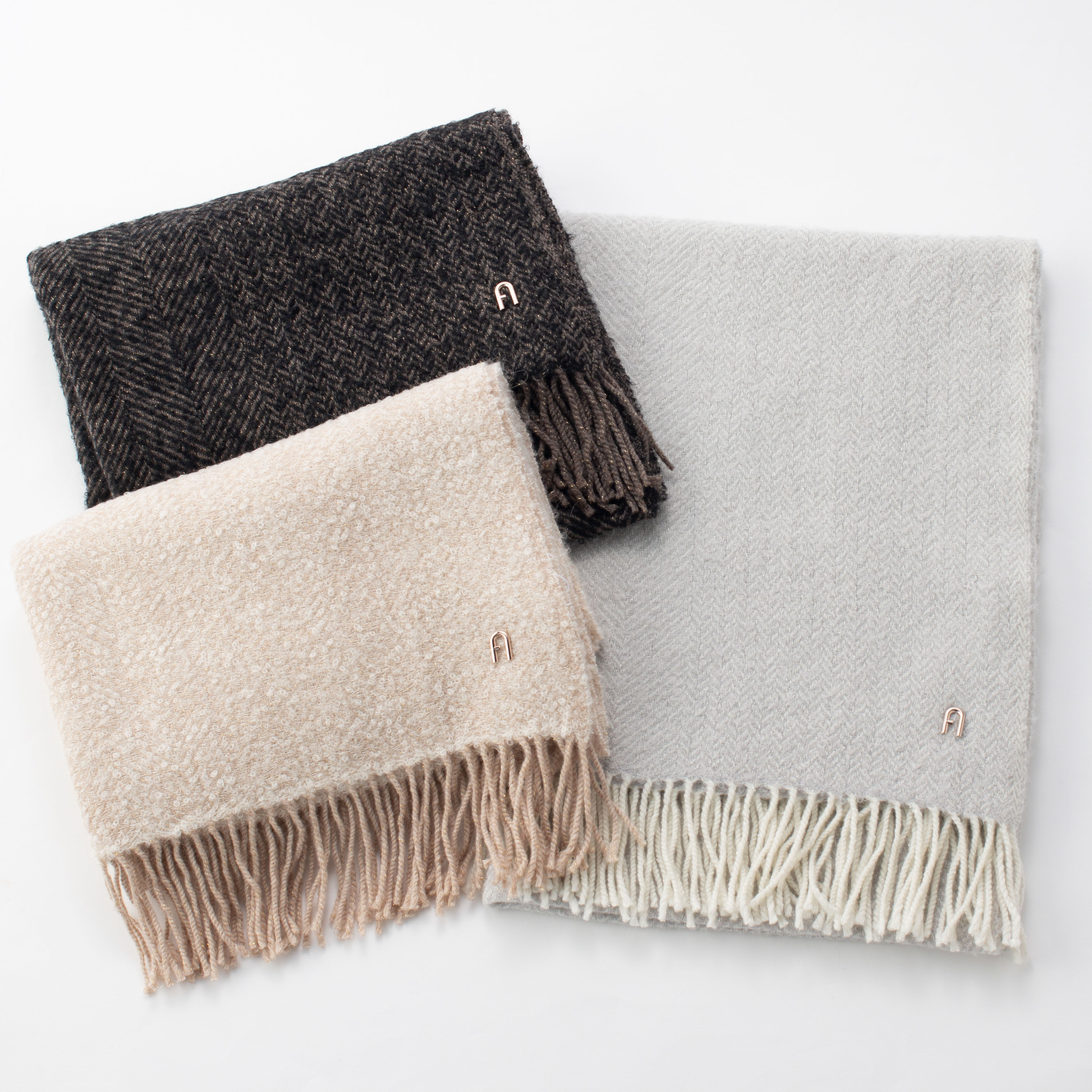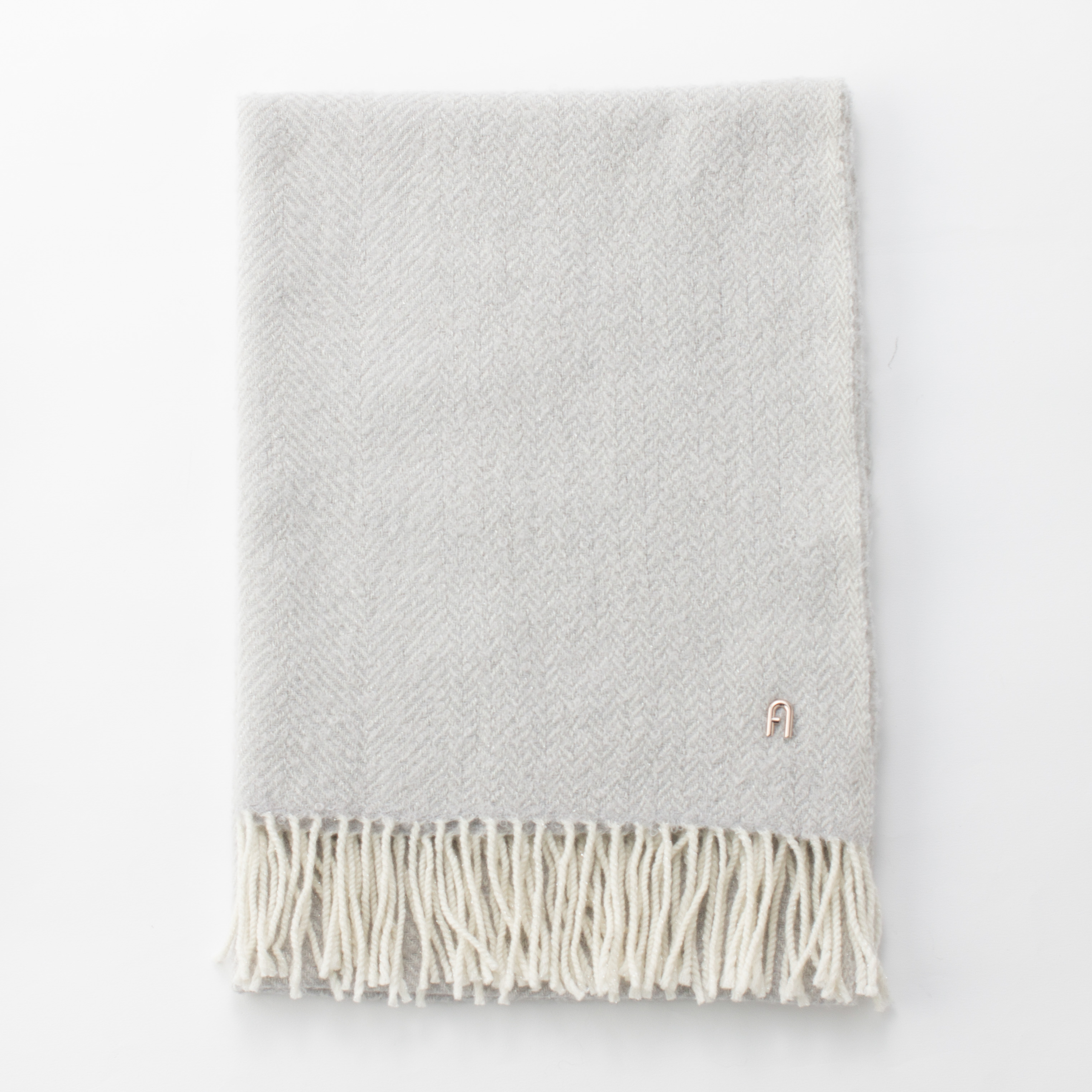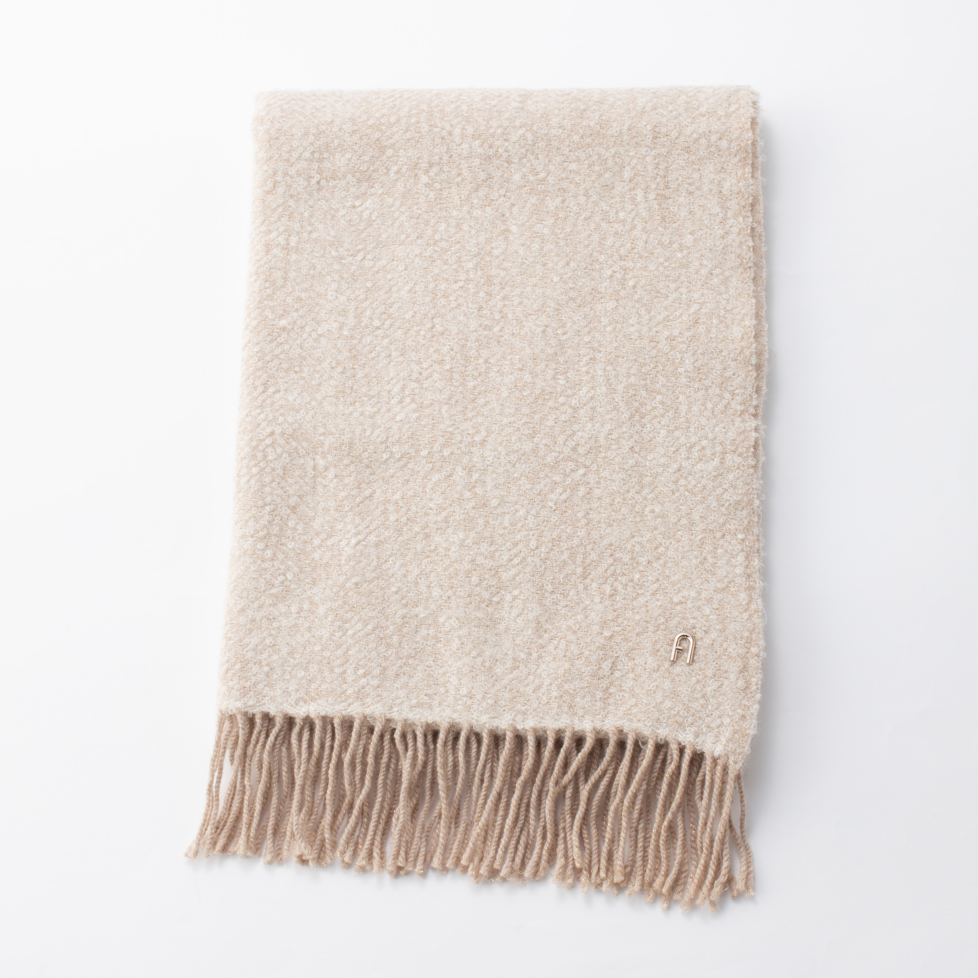 大口注文・法人のお問い合わせはこちら贅沢に使用したアルパカ混の素材で、ふんわりと柔らかな質感に。 メタルパーツのロゴを縫い付けた高級感のある仕様です。 さらに柔らかく立体感のある糸を使用したラメ入りストールで、洗練された高級感を添えます。