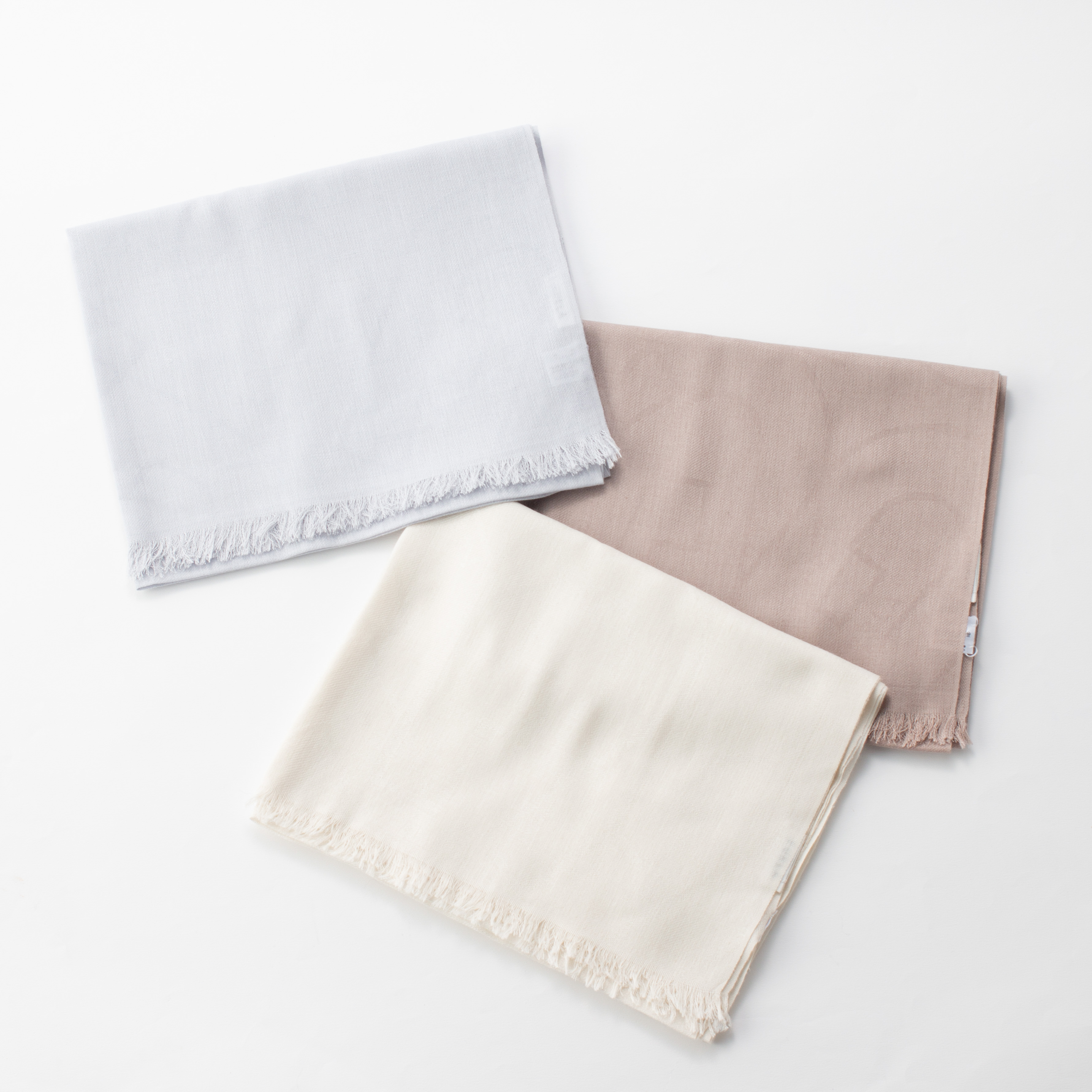 大口注文・法人のお問い合わせはこちらふわりと肌をすべる、なめらかなシルクの艶。そして、優しく包み込むカシミヤのぬくもり。 絹70%・カシミヤ30%の黄金比で織りなすストールは、日常に忘れられない上質なひとときを添えてくれます。