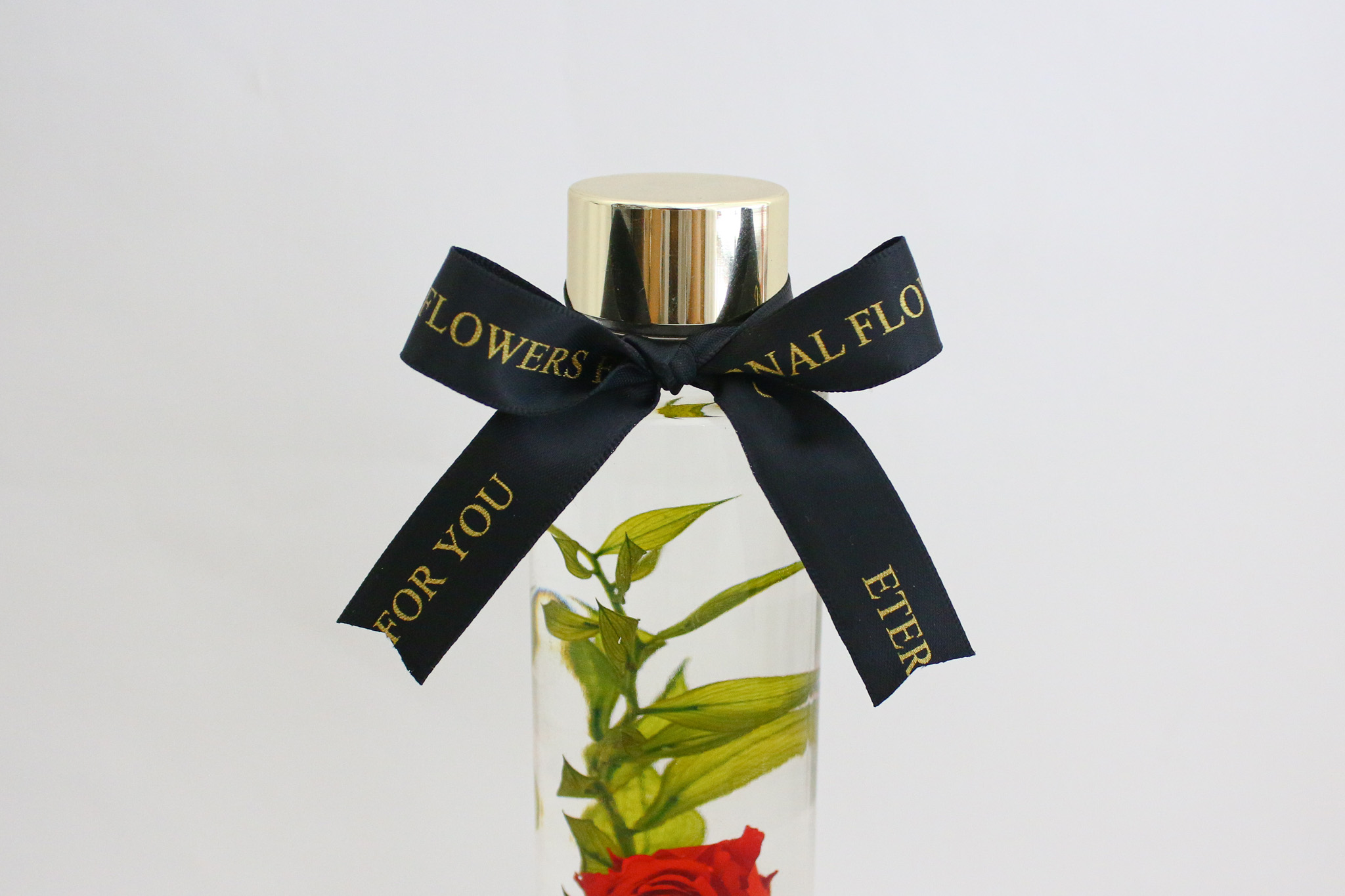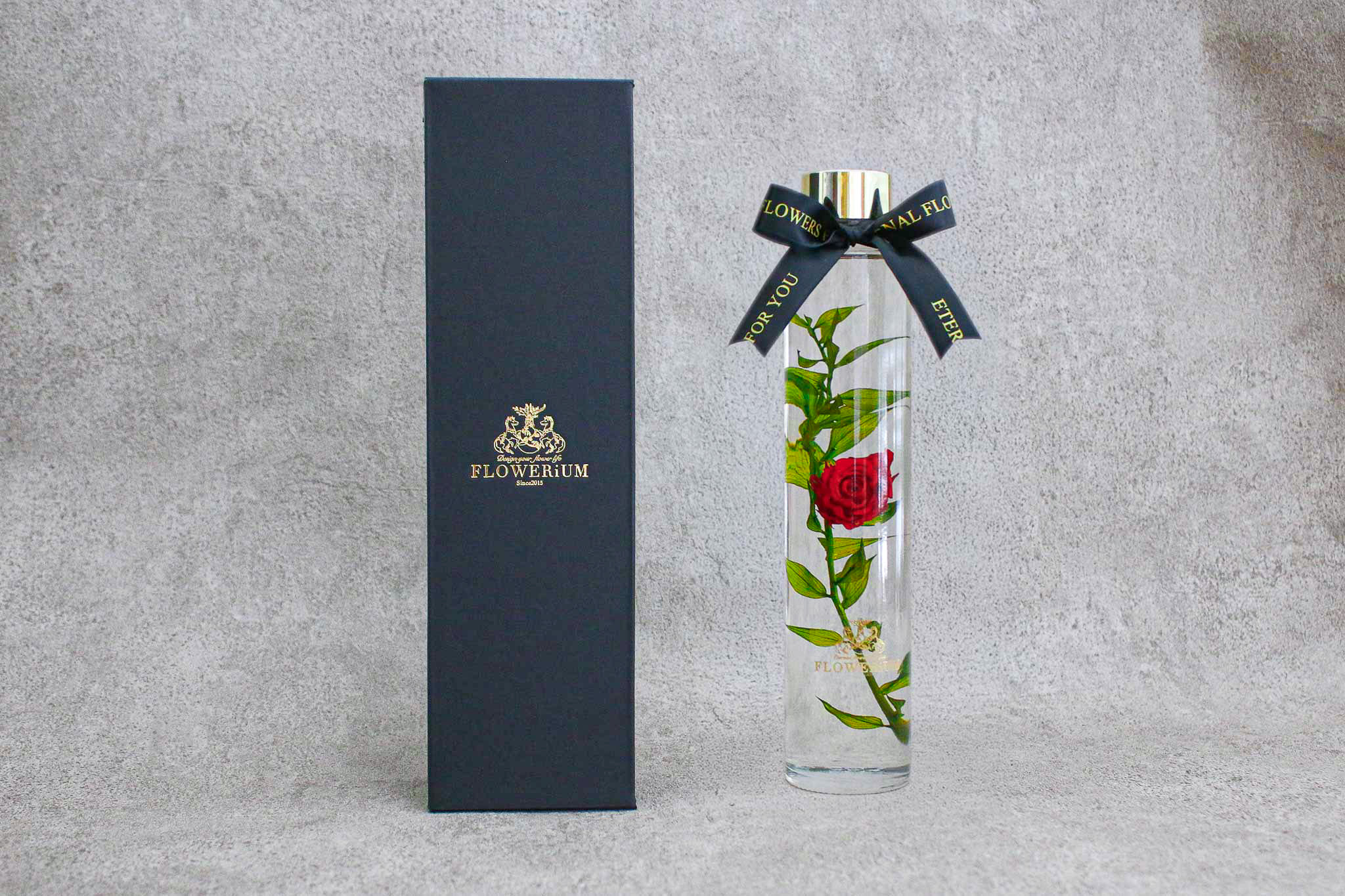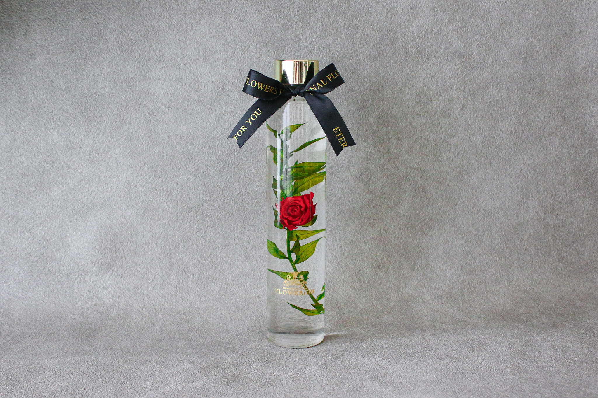 ガラスに咲く、色褪せない一輪の赤い薔薇。フラワーアーティストが手作業で生み出す世界に一つの贈り物です。洗練されたボトルが、どんな空間も上質に彩ります。プロポーズや記念日に、時を超えて輝き続ける「永遠の想い」を。忘れられない感動を大切なあの人へ届けます。