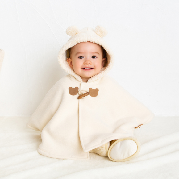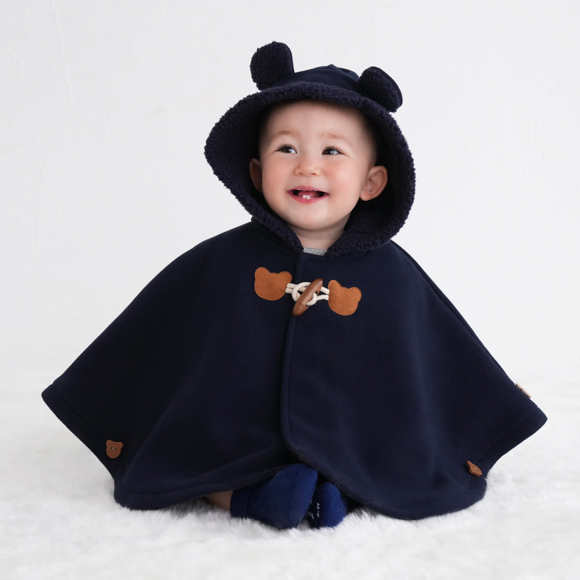 表地はなめらかなフリース、裏地はふっくらとしたボアフリース。2つの素材を合わせた特別な生地は、驚くほど軽くて、赤ちゃんを優しく温かく包み込みます。袖を通さずにさっと羽織れるので、お着替えが苦手なベビーにも、忙しいパパ・ママにも嬉しいデザイン。お出かけがもっと楽しくなりますね。