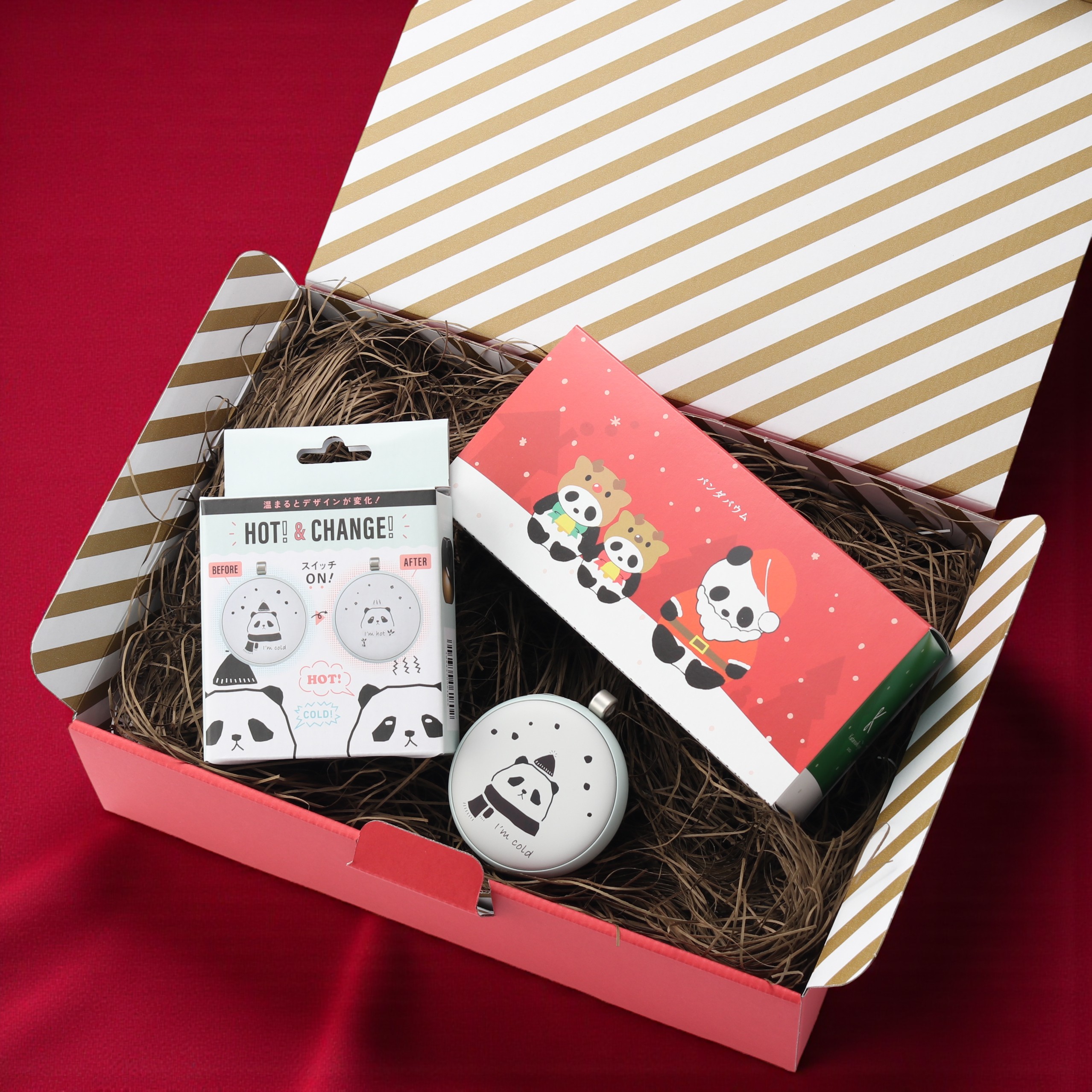 充電式のおしゃれなカイロと型ぬきが楽しい季節のパンダバウムのセットです。おしゃれなギフトボックスに詰め合わせてお届けします。心もからだも温まる冬の贈り物です。