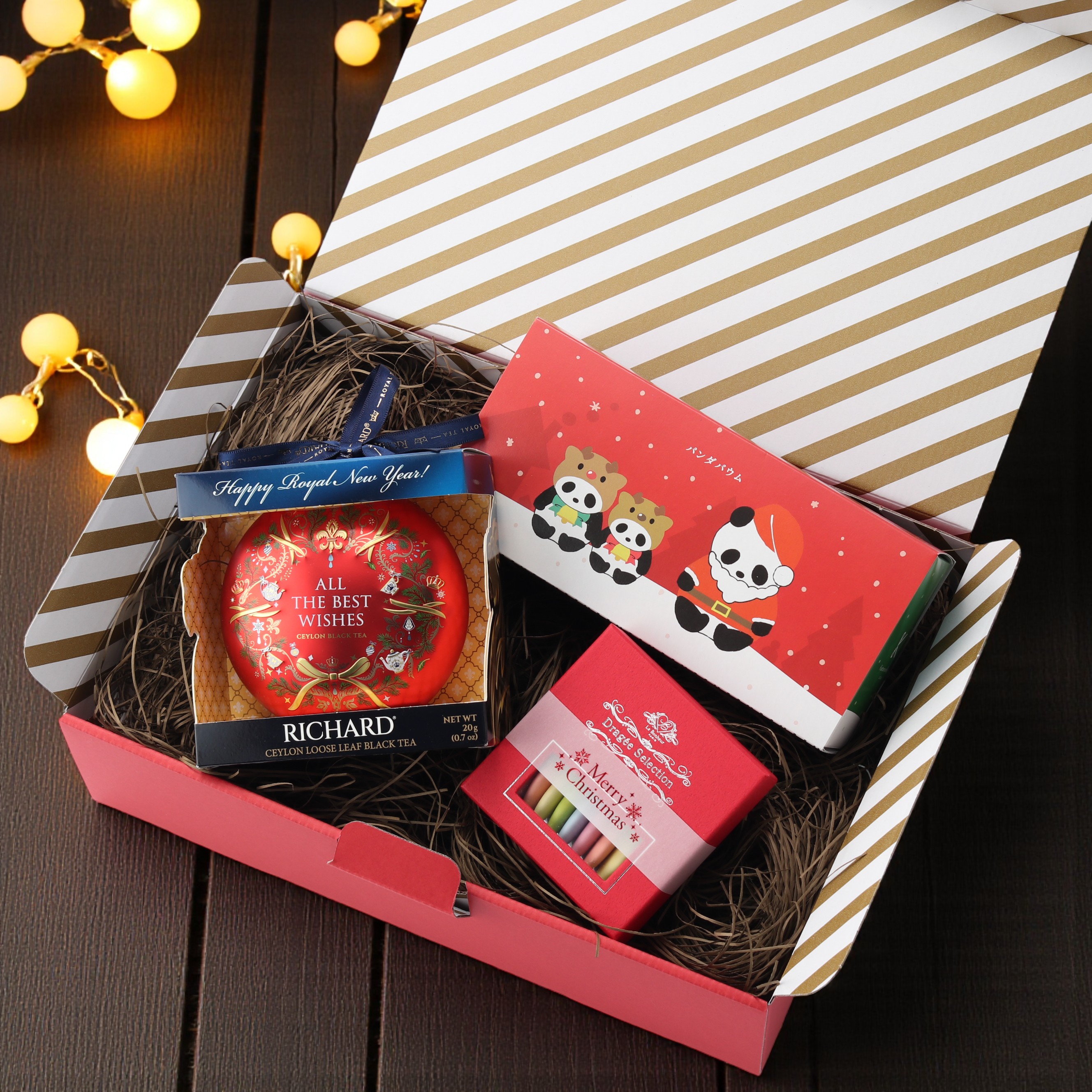 大口注文・法人のお問い合わせはこちらクリスマス限定のスイーツ2種(ドラジェ・パンダバウム)と紅茶のギフトセットです。おしゃれなギフトボックスに詰め合わせてお届けします。