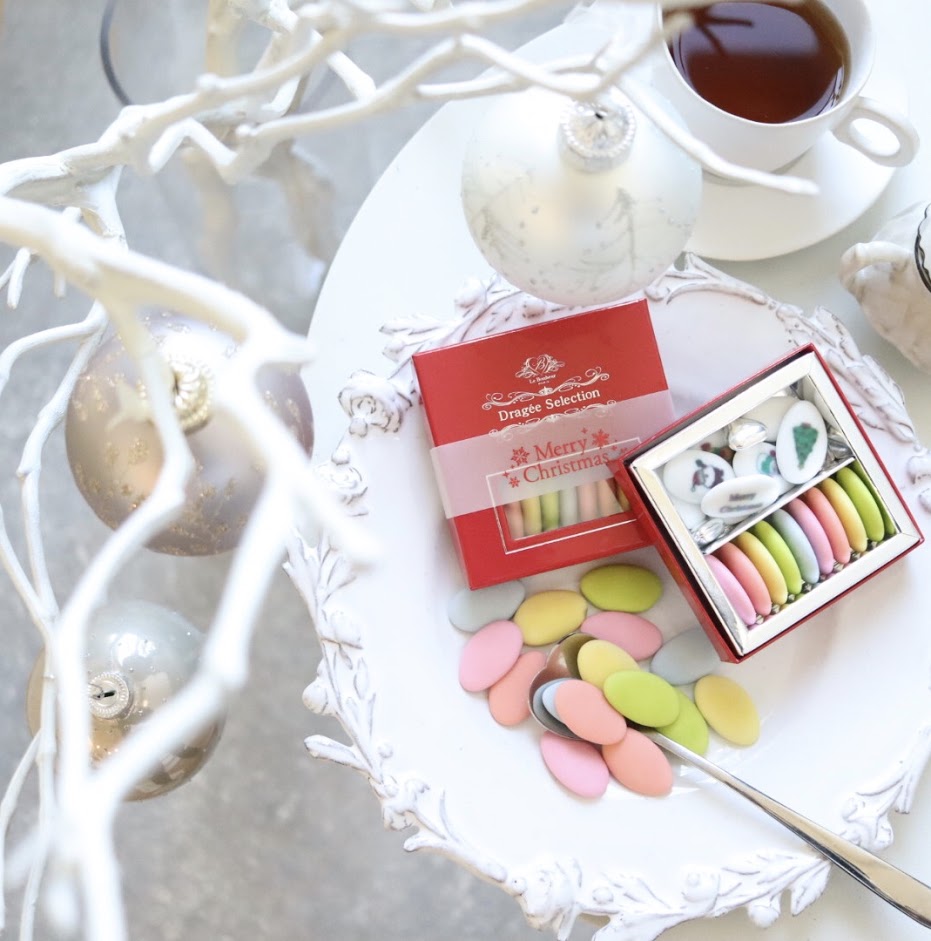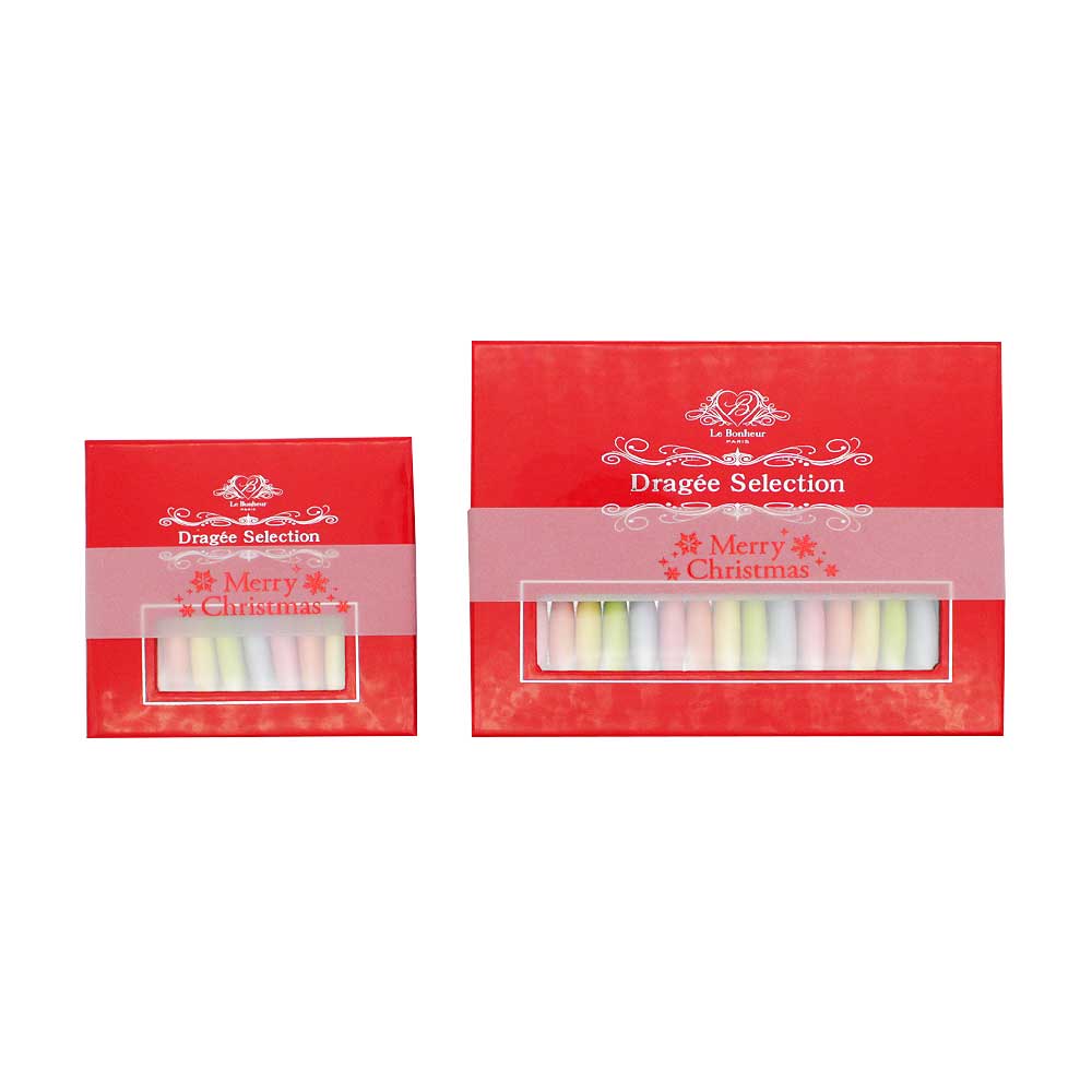 フランス語で「幸福の種」と呼ばれるドラジェに、クリスマスにちなんだイラストやメッセージをプリントして、赤のボックスにお詰めしました。小窓からのぞくカラフルなドラジェはクリスマスギフトにぴったりです。