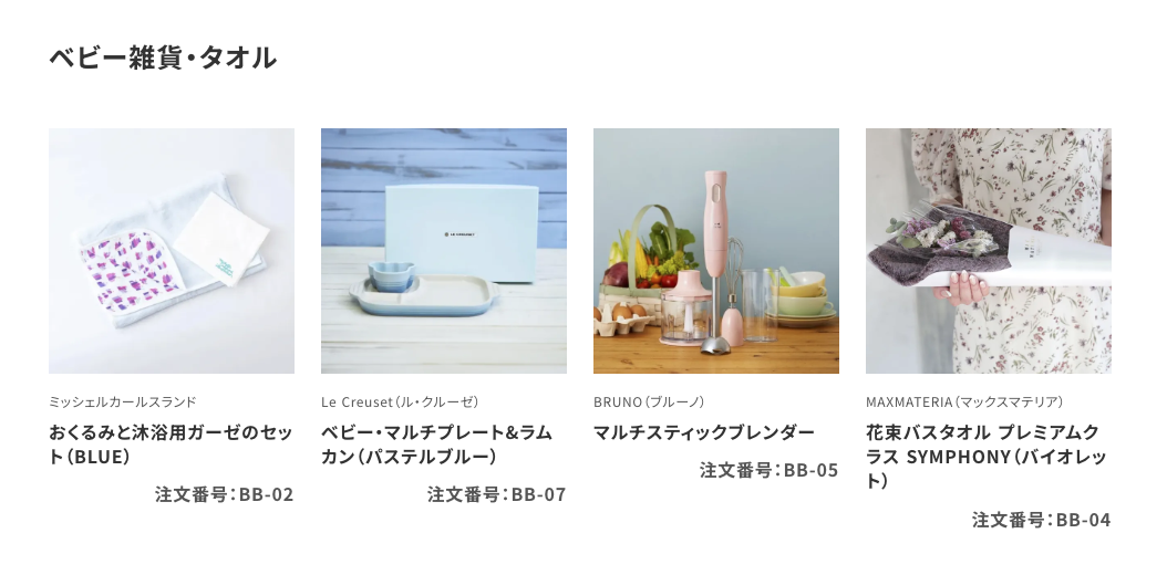 赤ちゃんが安心して使えるやさしい素材のベビーグッズや、 お母さんのためのケアアイテム、ご家族みんなで楽しめるグッズまで、 ギフト専門オンラインショップならではの幅広いラインナップをご用意いたしました。
